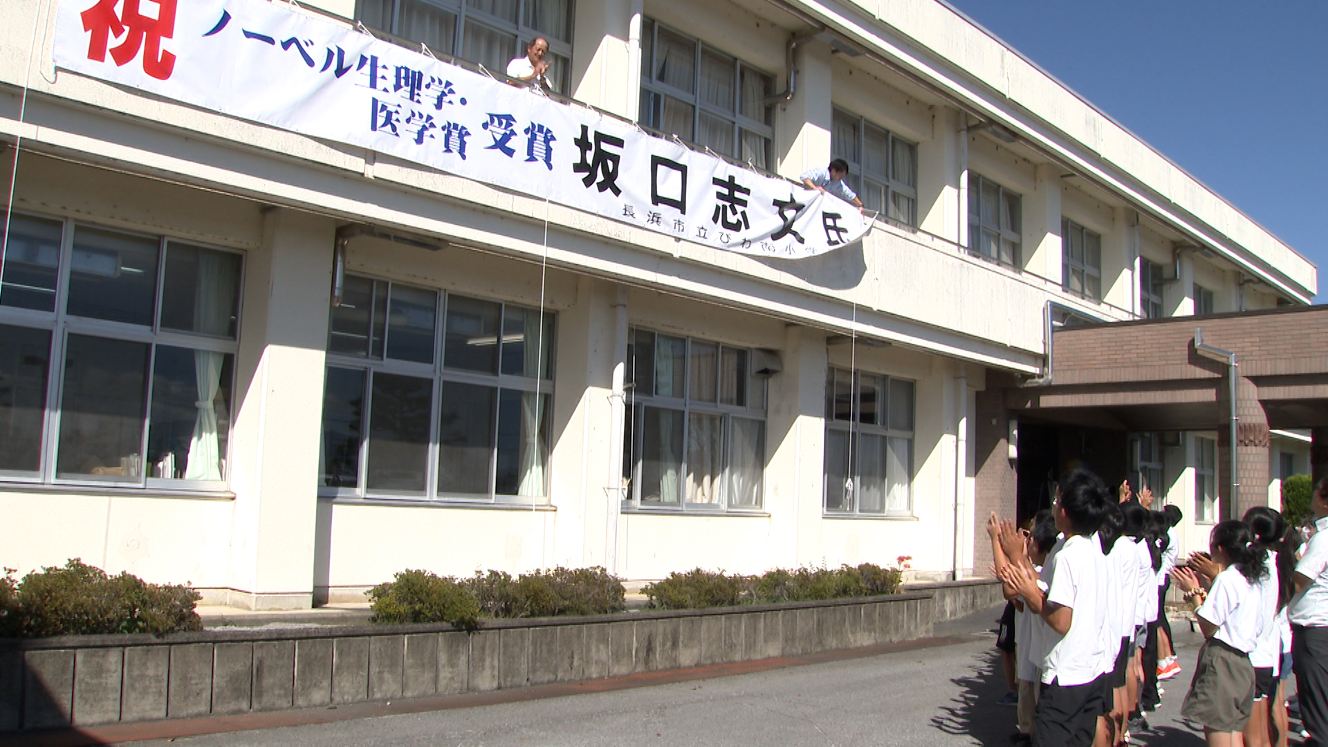 ノーベル生理学・医学賞の受賞が決まった長浜市出身の坂口志文さんの母校のびわ南小学校で9日、5年生と6年生の児童約50人が見守る中、受賞を祝う横断幕が校舎に掲げられました。