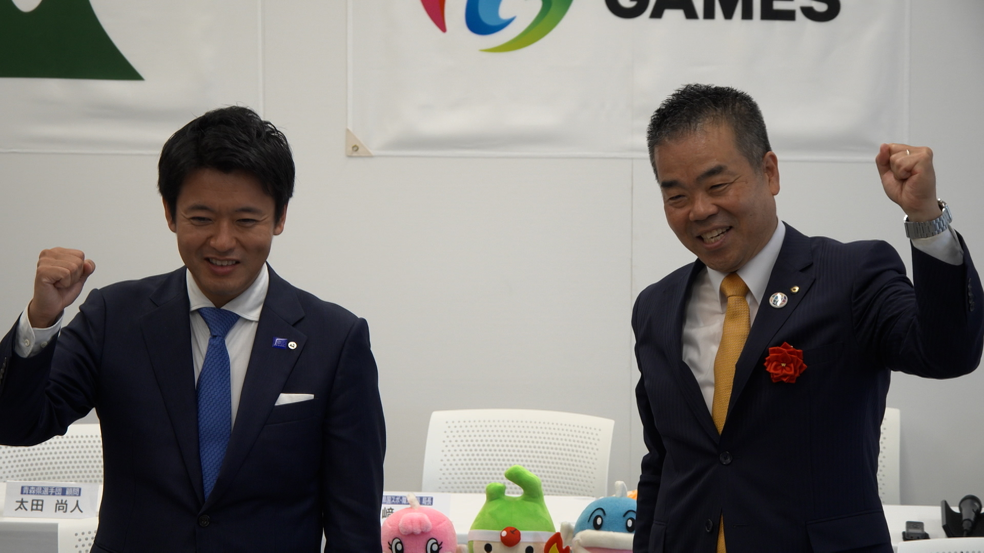 続いて、来年2026年に『青の煌めき あおもり国スポ』が開催される青森県の宮下宗一郎知事に、滋賀県の三日月大造知事から国スポ旗が渡されました。