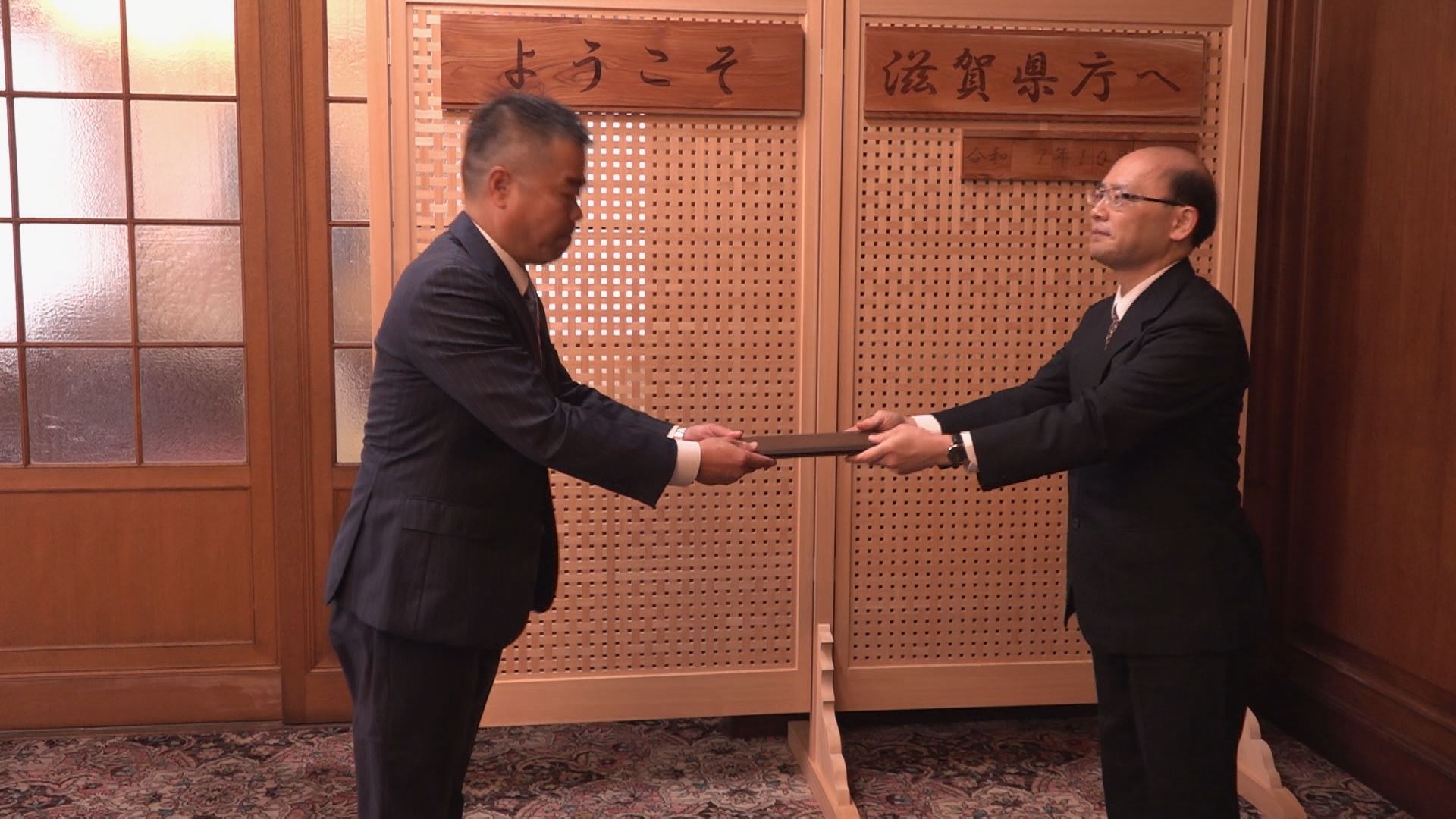 地域交通の維持などのために滋賀県が導入を検討している、いわゆる交通税について議論してきた県税制審議会は、導入する場合は県民の理解を得る努力が必要などとする審議会の意見をまとめ、20日、三日月知事に答申しました。答申は、県税制審議会の諸富徹会長から三日月知事に手渡されました。