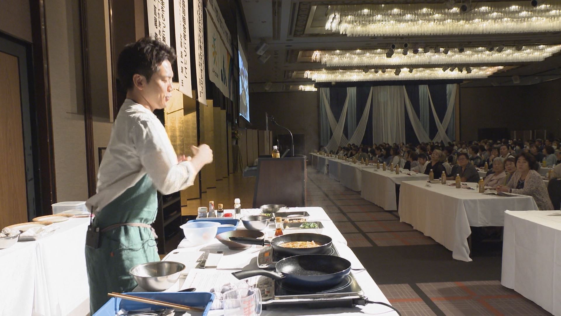 JAしが女性協議会などが20日、近江八幡市で「食のつどい」を開き、調理の実演では、料理家が日々のご飯をおいしくするコツなどを参加者に伝授しました。