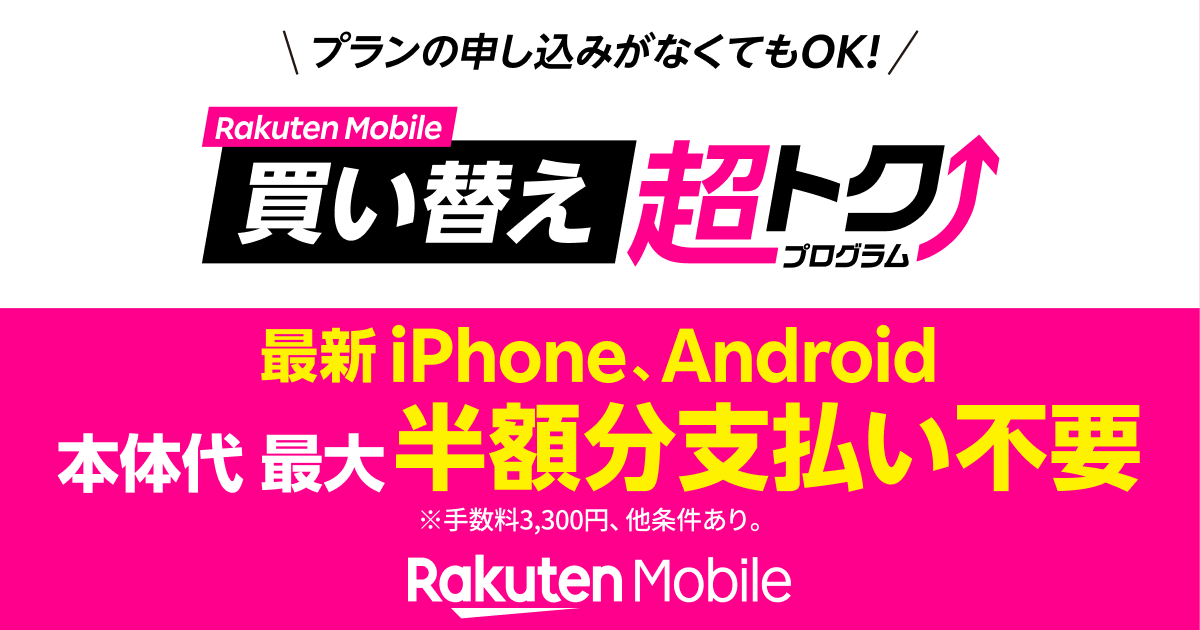 | iPhone13 | 2,264円〜 25ヶ月目に返却 | 楽天モバイル ▶買い替え超トクプログラムを適用 | 詳しい方法を確認 |