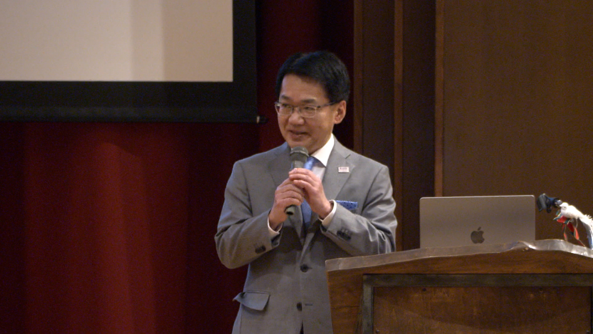 講演会では、同志社大学の小原克博学長が登壇し、「愛と平和に満ちた共に生きる社会を目指して」と題してヴォーリズ氏が作詞した同志社大学のカレッジソングに込められた人生観についてや、同志社大学の設立者・新島襄との思想的な共通点などについて講演しました。