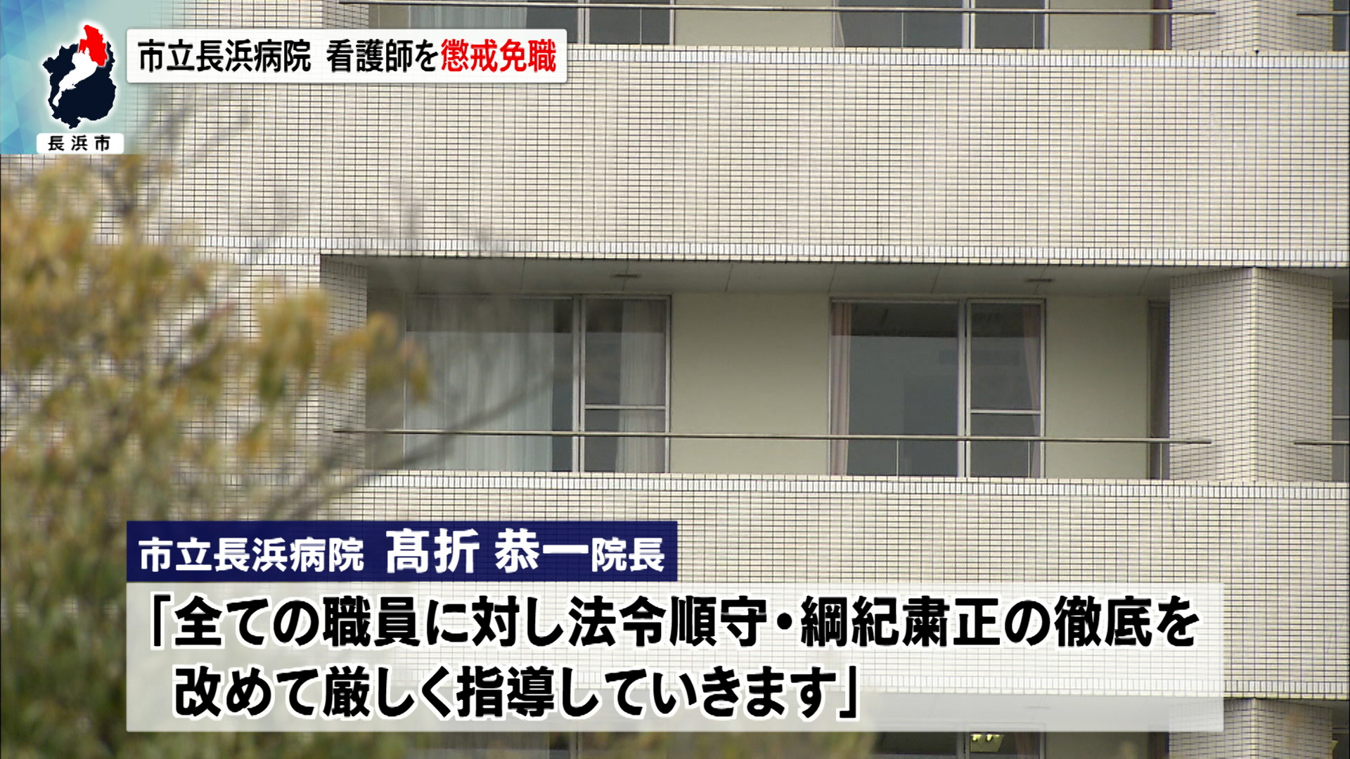 市立長浜病院の高折恭一院長は「誠に遺憾であり、深くおわび申し上げます。生命の安全に関わる病院として、事態を重く受け止め、全ての職員に対し、法令順守・綱紀粛正の徹底を改めて厳しく指導していきます」とコメントしています。