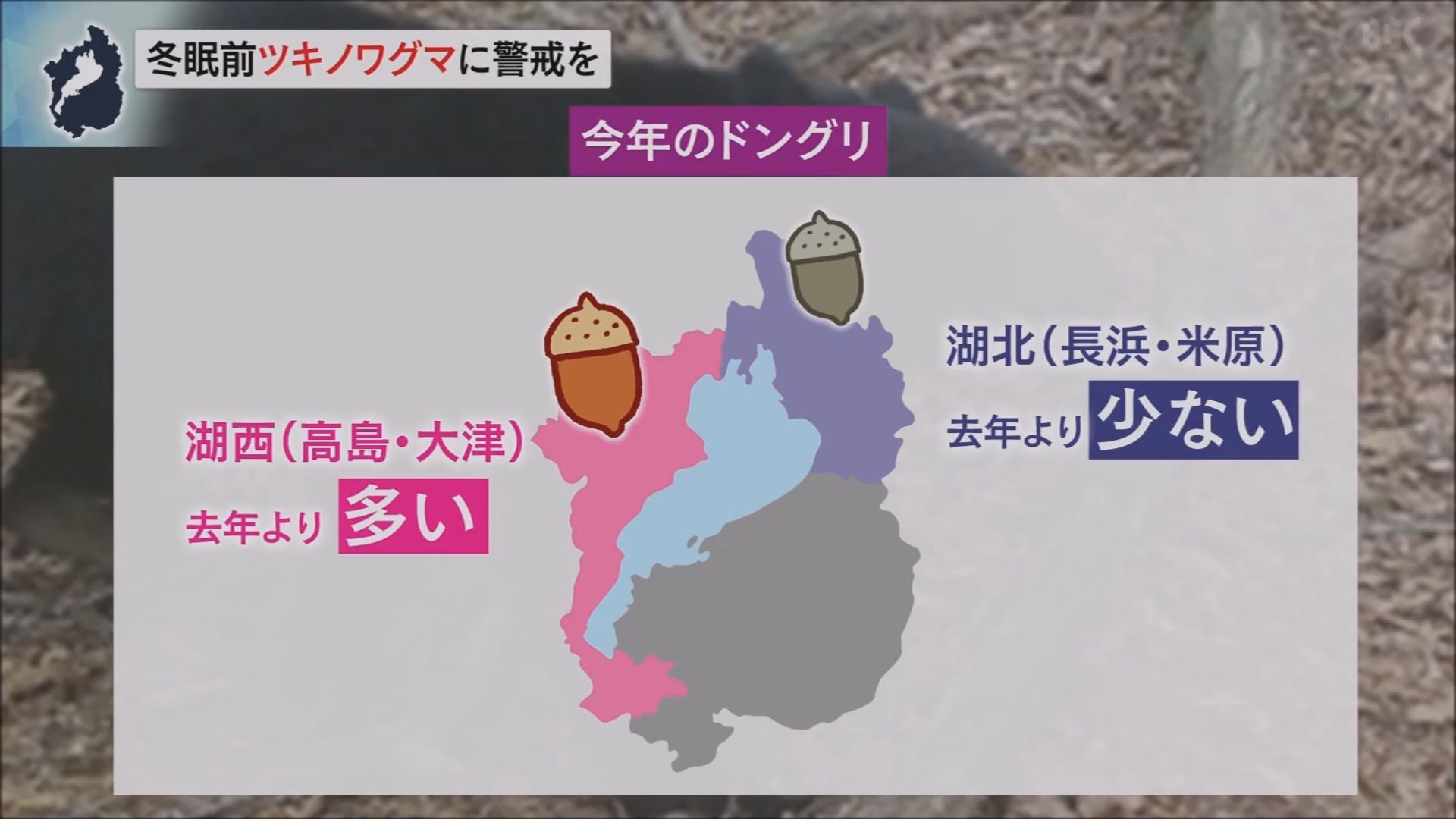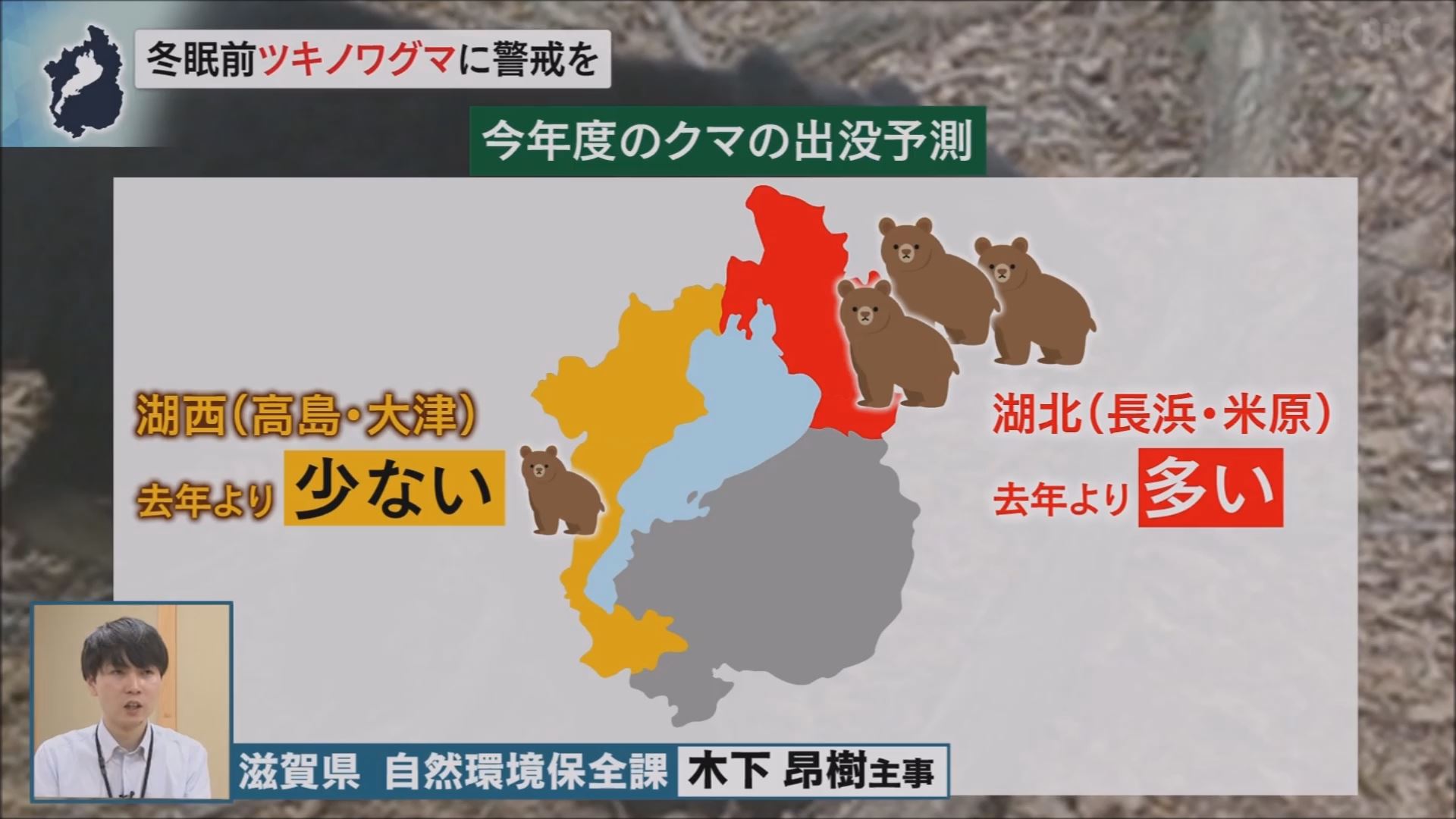 滋賀県自然環境保全課の木下主事は「湖北では出没が多くなると予想されるので、去年よりも注意して過ごしてほしい。湖西では、去年よりも少なくなる予測にはなっているが、出没する可能性は十分あるので、注意して過ごして欲しい。」と話しています。