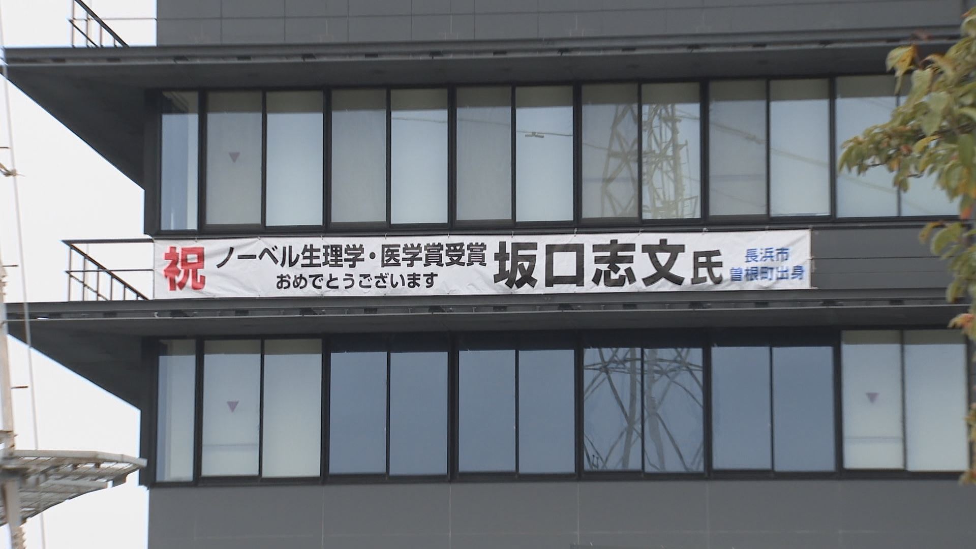 ノーベル生理学・医学賞を受賞した大阪大学特任教授の坂口志文氏は、長浜市出身の74歳で、坂口さんの受賞を祝して長浜市役所の庁舎には横断幕が掲げられました。