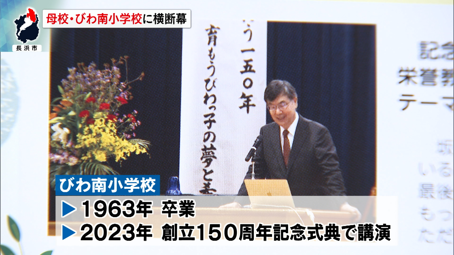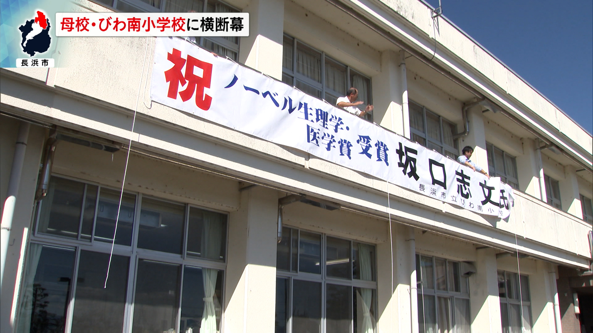 ノーベル賞 坂口さんの母校・びわ南小学校に横断幕