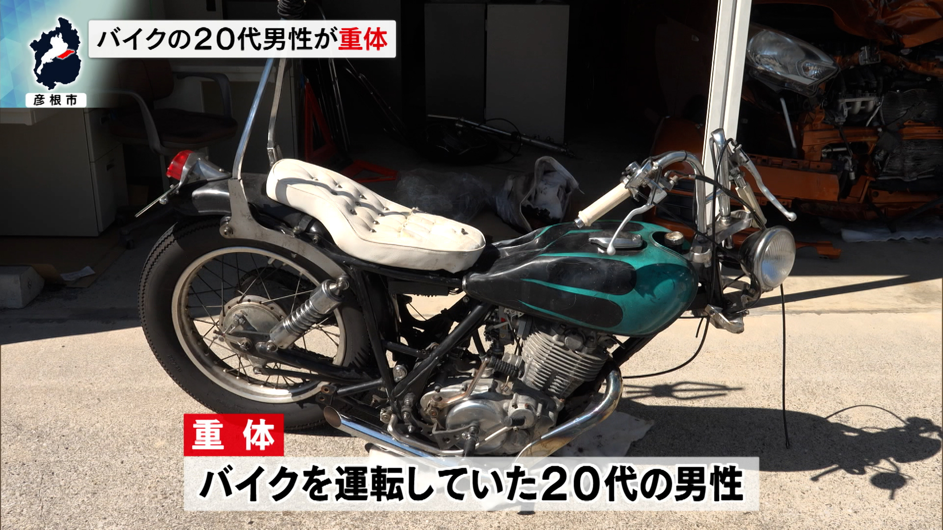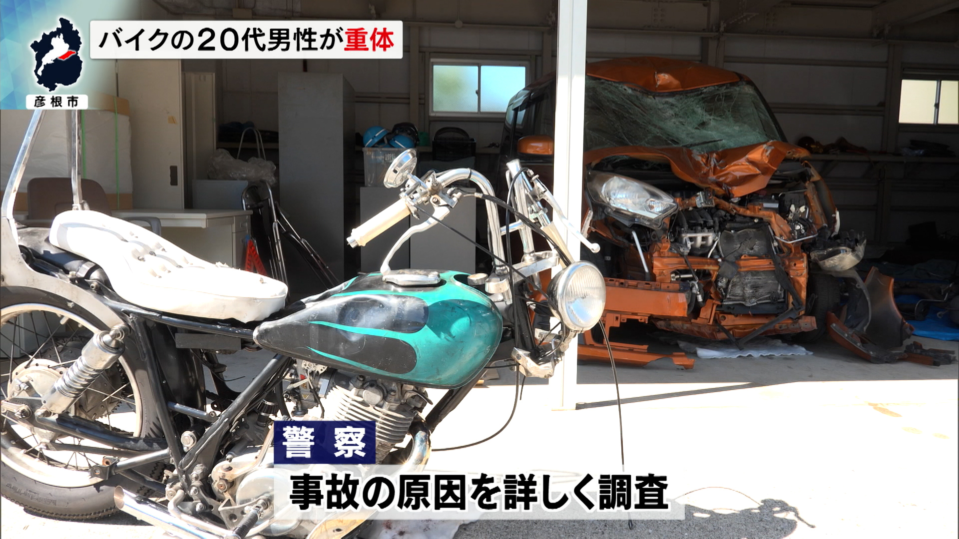 警察によりますと、10日午前6時前、彦根市佐和山町の国道8号線で、直進していたバイクと、右折しようとした軽乗用車が衝突しました。この事故で、バイクを運転していた会社員の20代の男性が頭や腰の骨を折り、意識不明の重体だということです。
