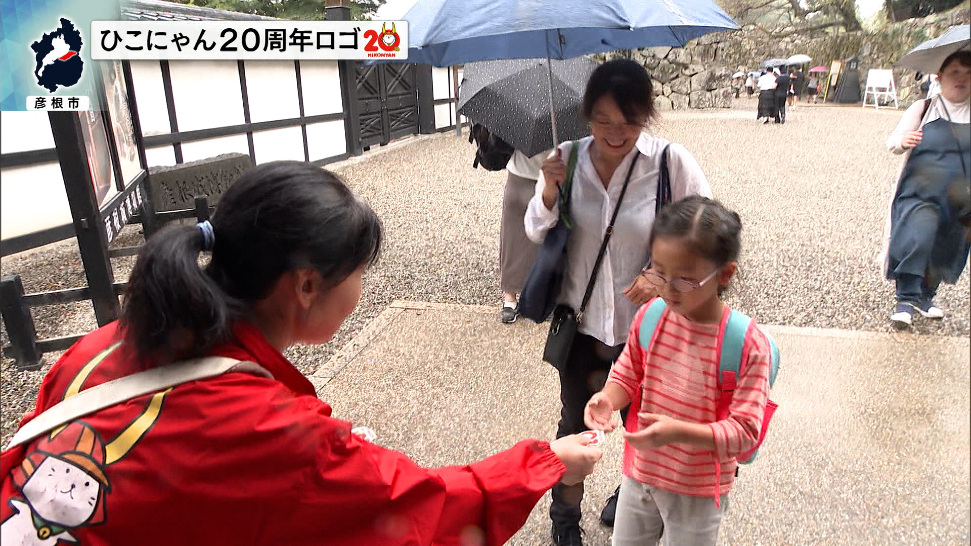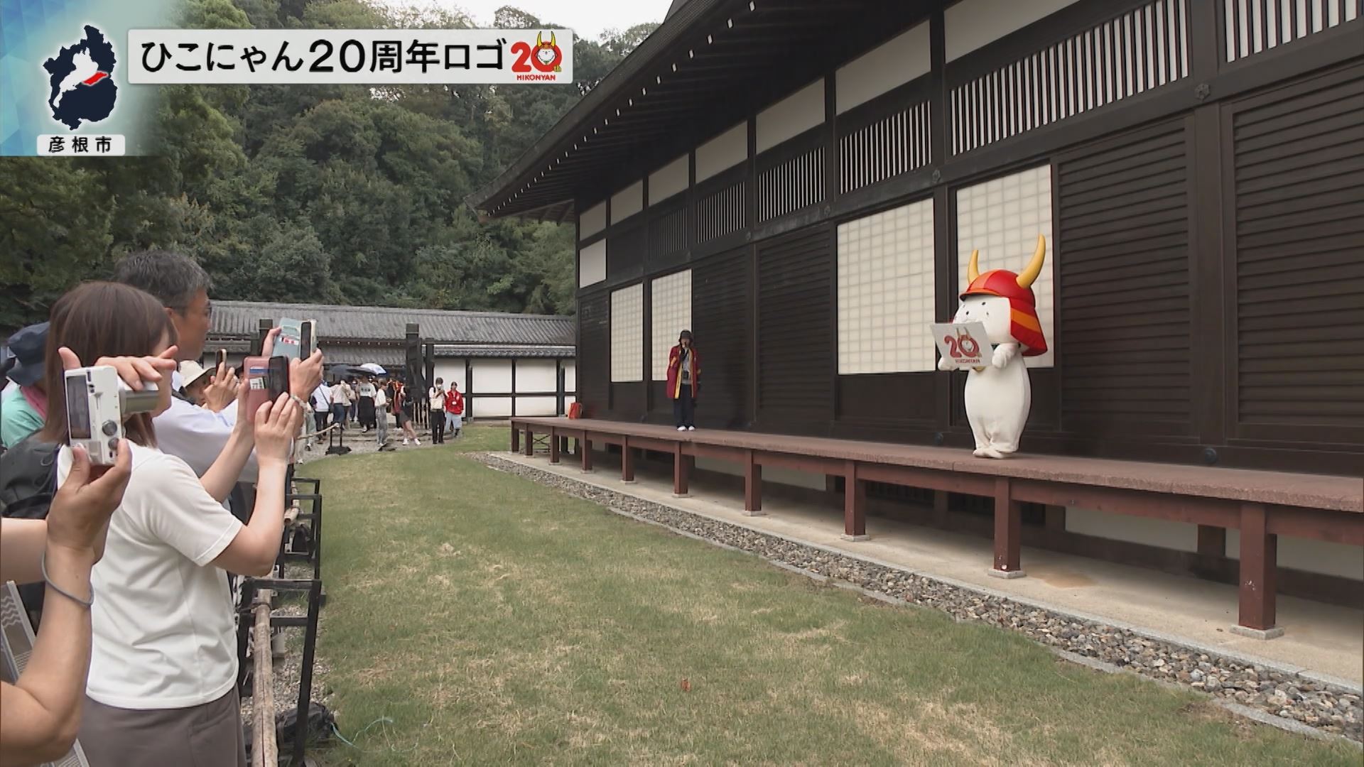 「ひこにゃん20周年記念日」まで、200日となった9月25日、お散歩中のひこにゃんが、「20周年ロゴ」をお披露目すると歓声が沸き、多くの人がカメラを向けていました。