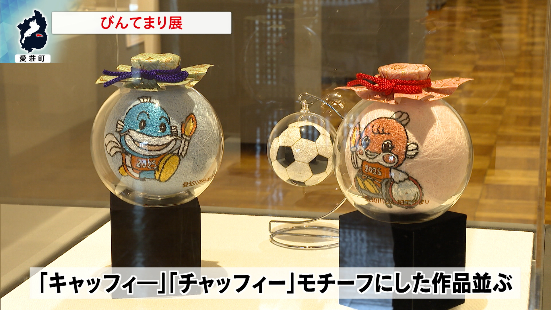 「愛知川びん細工手まり」は、フラスコ型のガラス瓶に手まりを入れた工芸品で、県の伝統的工芸品に指定されています。展示では、国スポ・障スポにちなみ、手まりに緻密に刺繍された大会のマスコットキャラクター「キャッフィー」と「チャッフィー」が並んでいます。