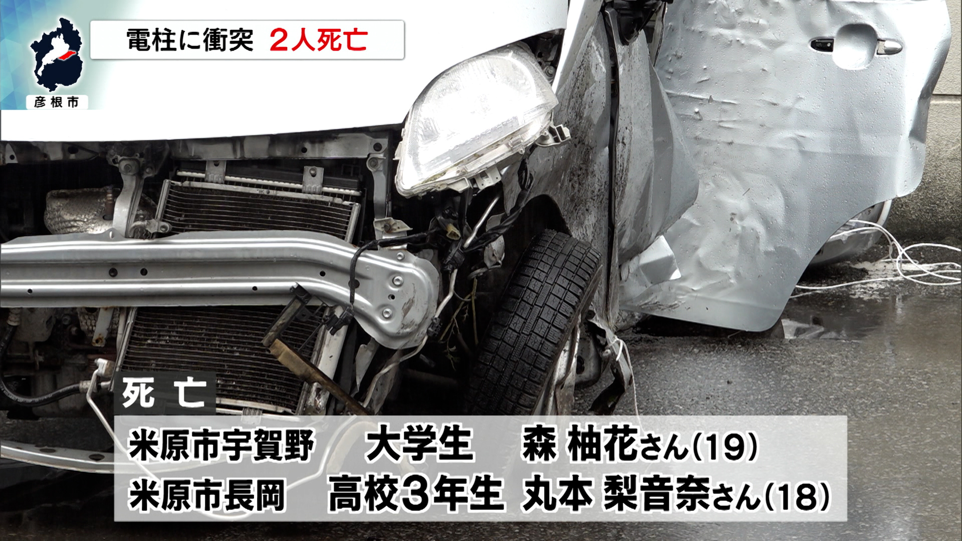 26日朝、彦根市の市道で軽乗用車が電柱に衝突する事故があり、後部座席に乗っていた10代の女性2人が死亡しました。事故があったのは、彦根市堀町の市道で、警察によりますと、26日7時ごろ、軽乗用車が対向車線にはみ出し電柱に衝突しました。乗っていた男女3人が病院に運ばれましたが、後部座席に乗っていた米原市宇賀野の大学生・森柚花さん19歳と、米原市長岡の高校3年生・丸本梨音奈さん18歳の死亡が確認されました。運転していた彦根市に住む20歳の会社員の男性も、ろっ骨を折るなどの重傷です。男性は、2人を同じアルバイト先に送る途中だったということです。
