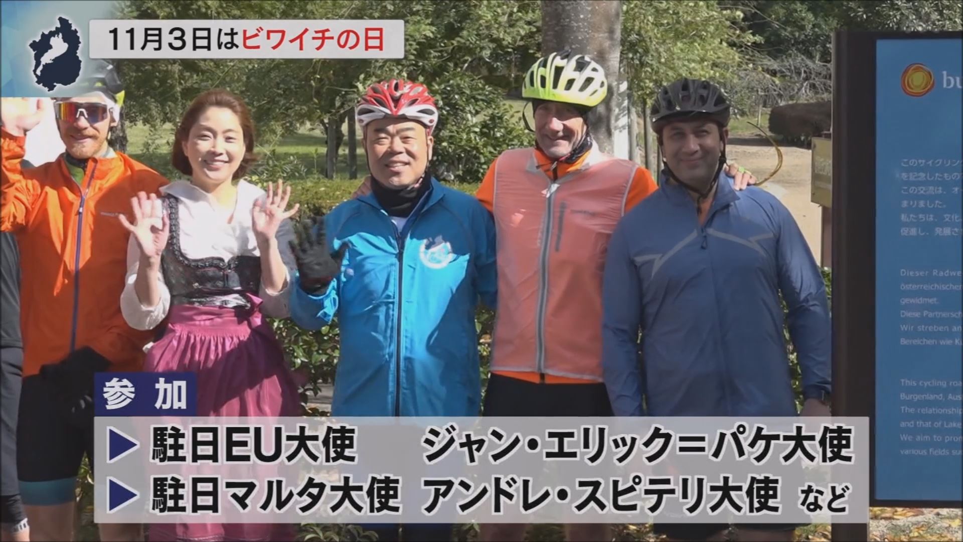 自転車でびわ湖を一周する通称「ビワイチ」。滋賀県では、2022年にビワイチ推進条例を施行し、11月3日を「ビワイチの日」と定めました。今年のテーマは「びわ湖を一周しなくても、自転車で滋賀を楽しめばもう、ビワイチ!」。今回は、三日月知事と駐日EU大使のジャン・エリック=パケ大使や駐日マルタ大使のアンドレ・スピテリ大使が参加しました。