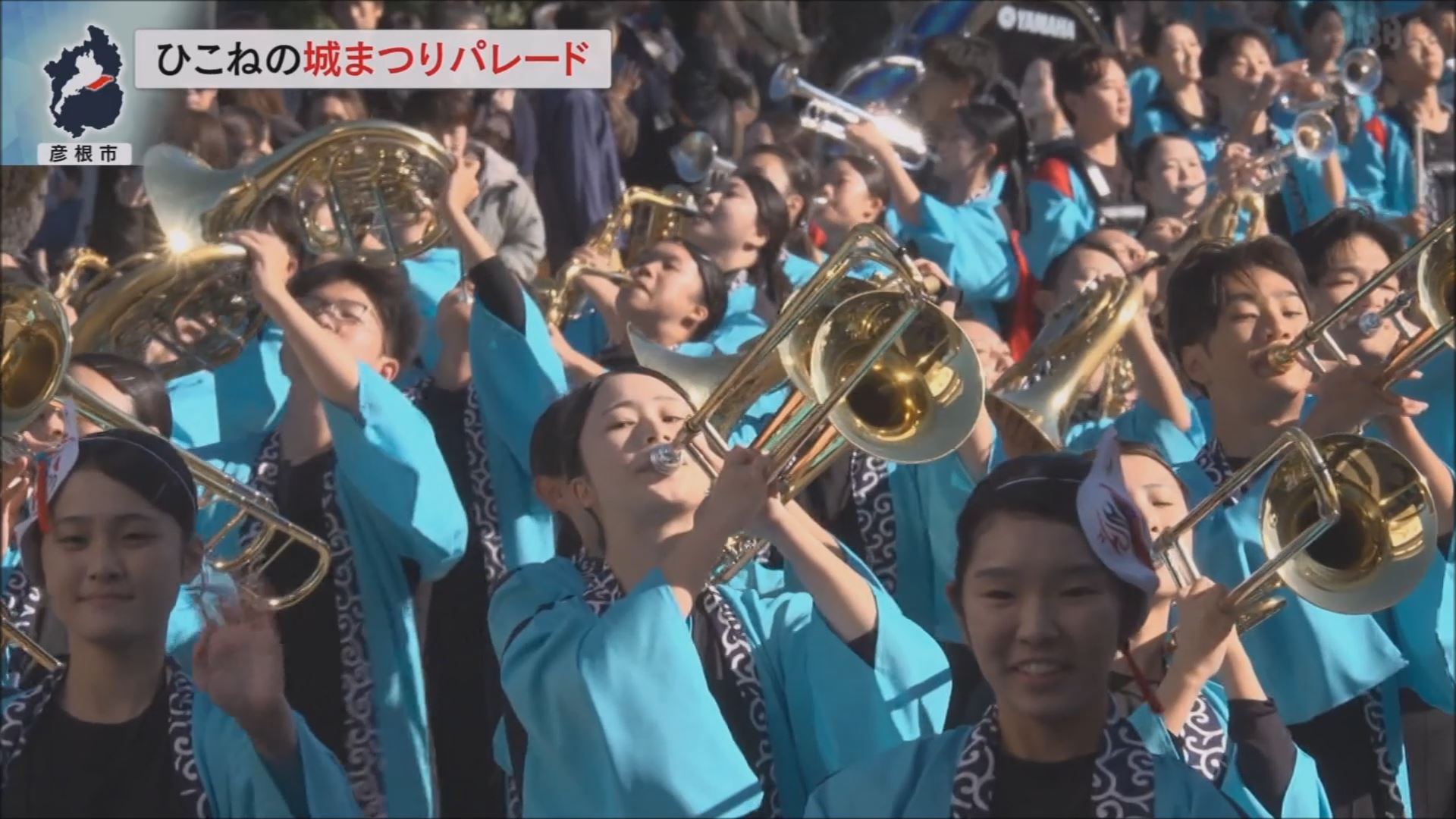 パレードには、時代装束に身を包んだ子どもたちの大名行列をはじめ、吹奏楽部やマーチングバンドの児童・生徒らが参加し、朱色の武具を身につけた「井伊の赤備え」の家臣団を従え、彦根藩の初代藩主・井伊直政役の俳優・渡辺大(わたなべだい)さんが登場して馬上から手を振りました。