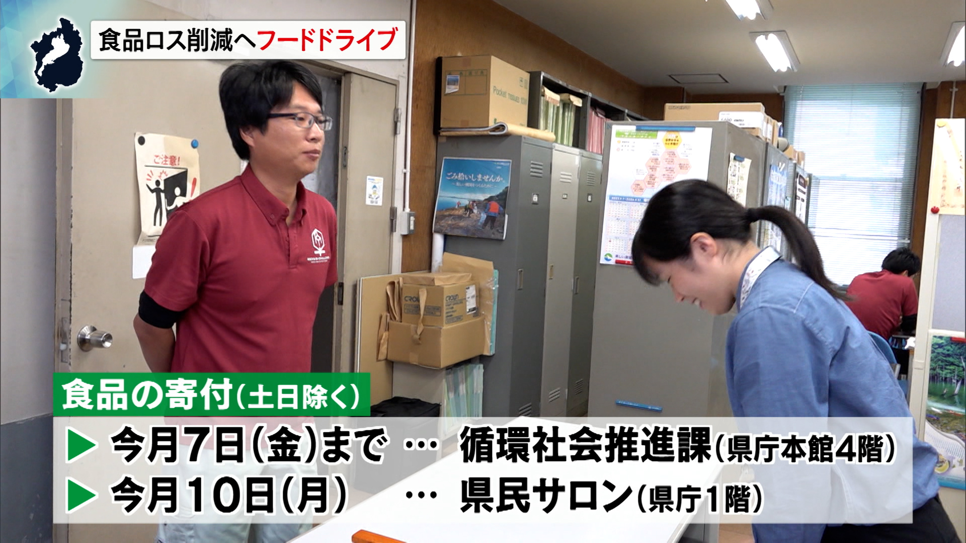 食品の寄附は職員だけではなく誰でもでき、土曜日曜を除き、11月7日の金曜日までは県庁本館4階の循環社会推進課で、最終日の10日の月曜日は1階の県民サロンで受け付けています。