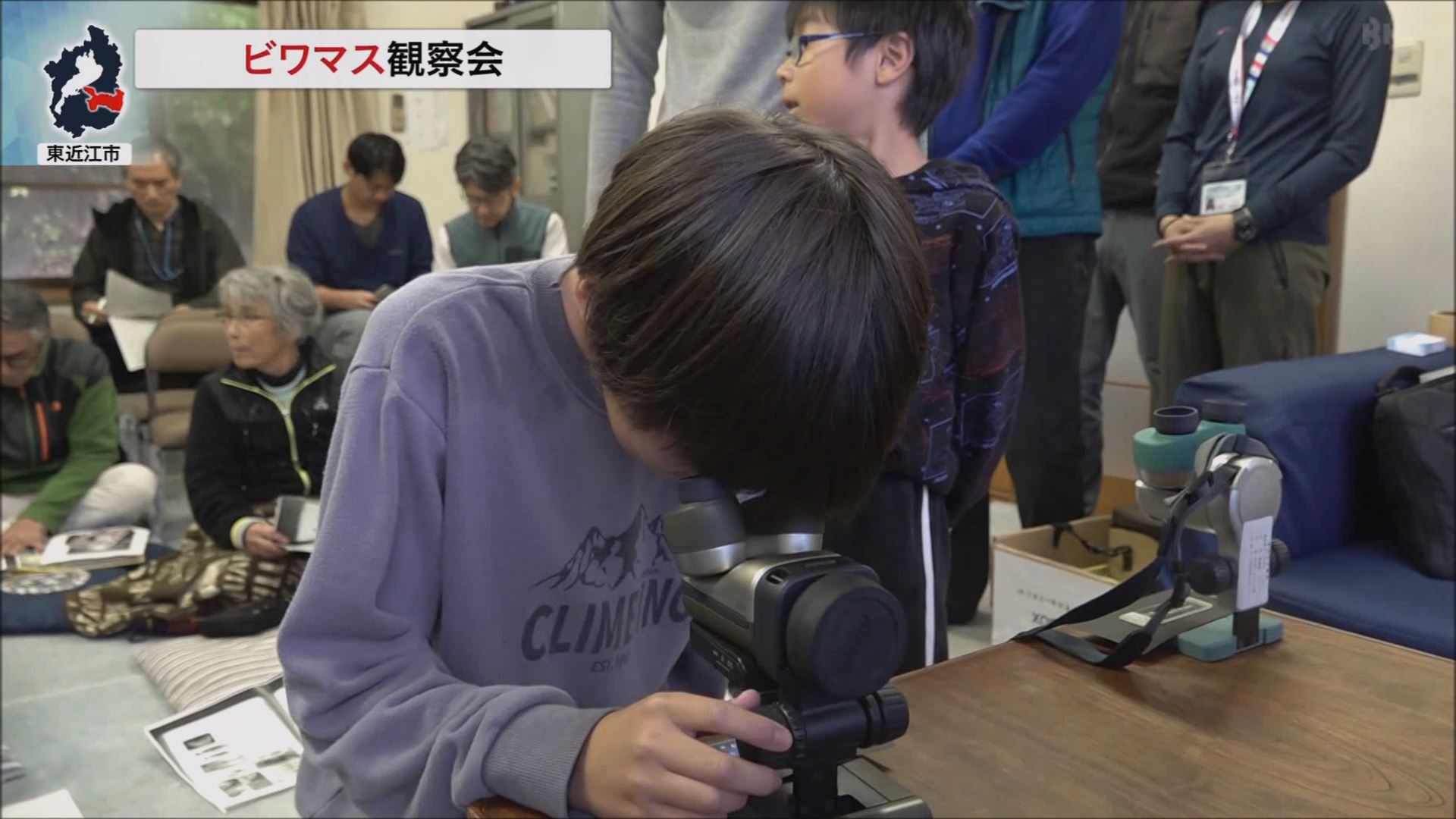 川での観察後、藤岡特別研究員から、ビワマスの生態などについて解説があり、採取してきたウロコを顕微鏡で観察するなどしました。