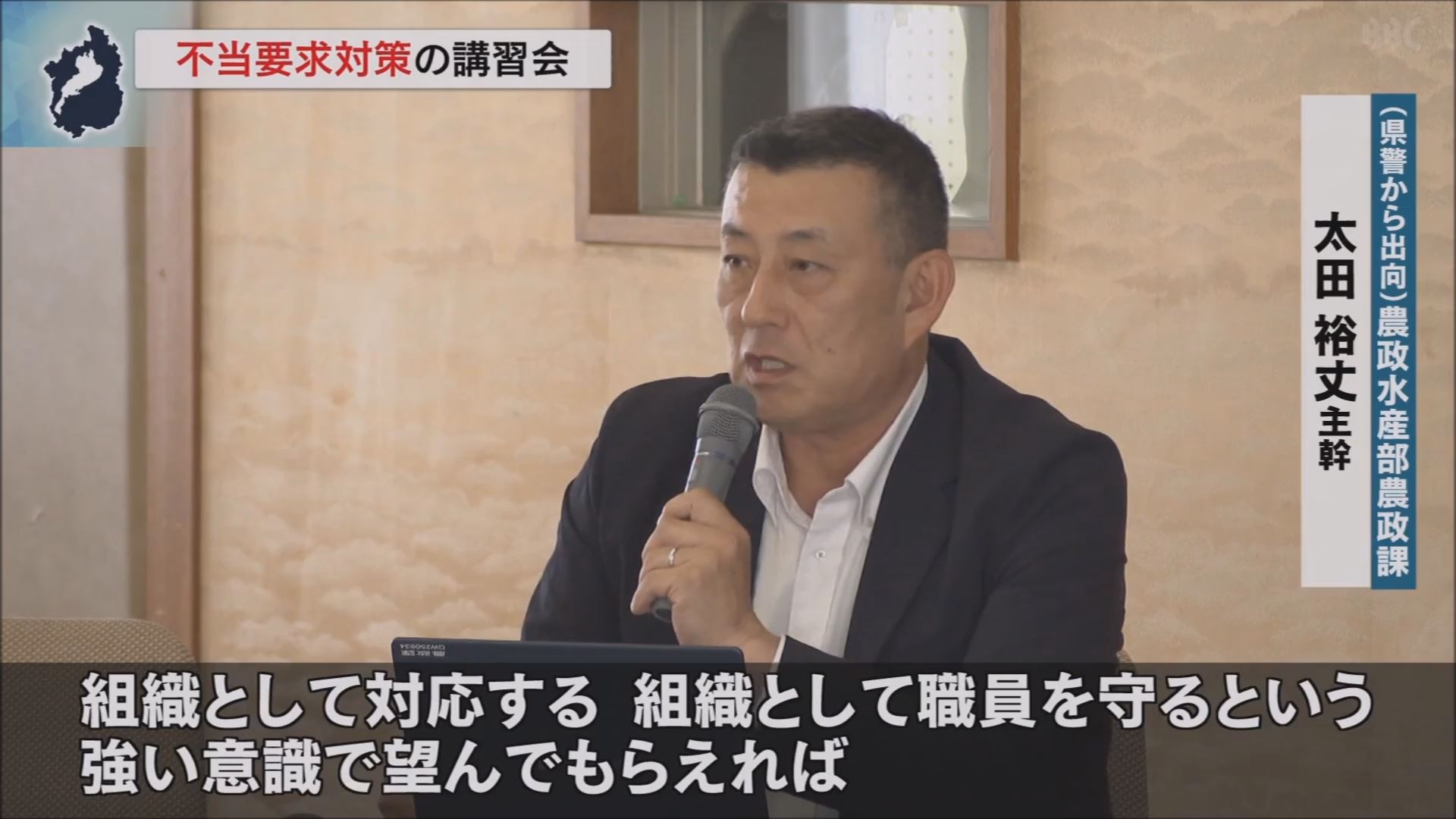 講習会では、県警の組織犯罪対策課による不当要求のロールプレイが行われたほか、県警から県の農政課に出向している太田裕丈主幹が講義を行い、過去の事例などを交えながら不当要求にどのように対応すれば良いかを話しました。