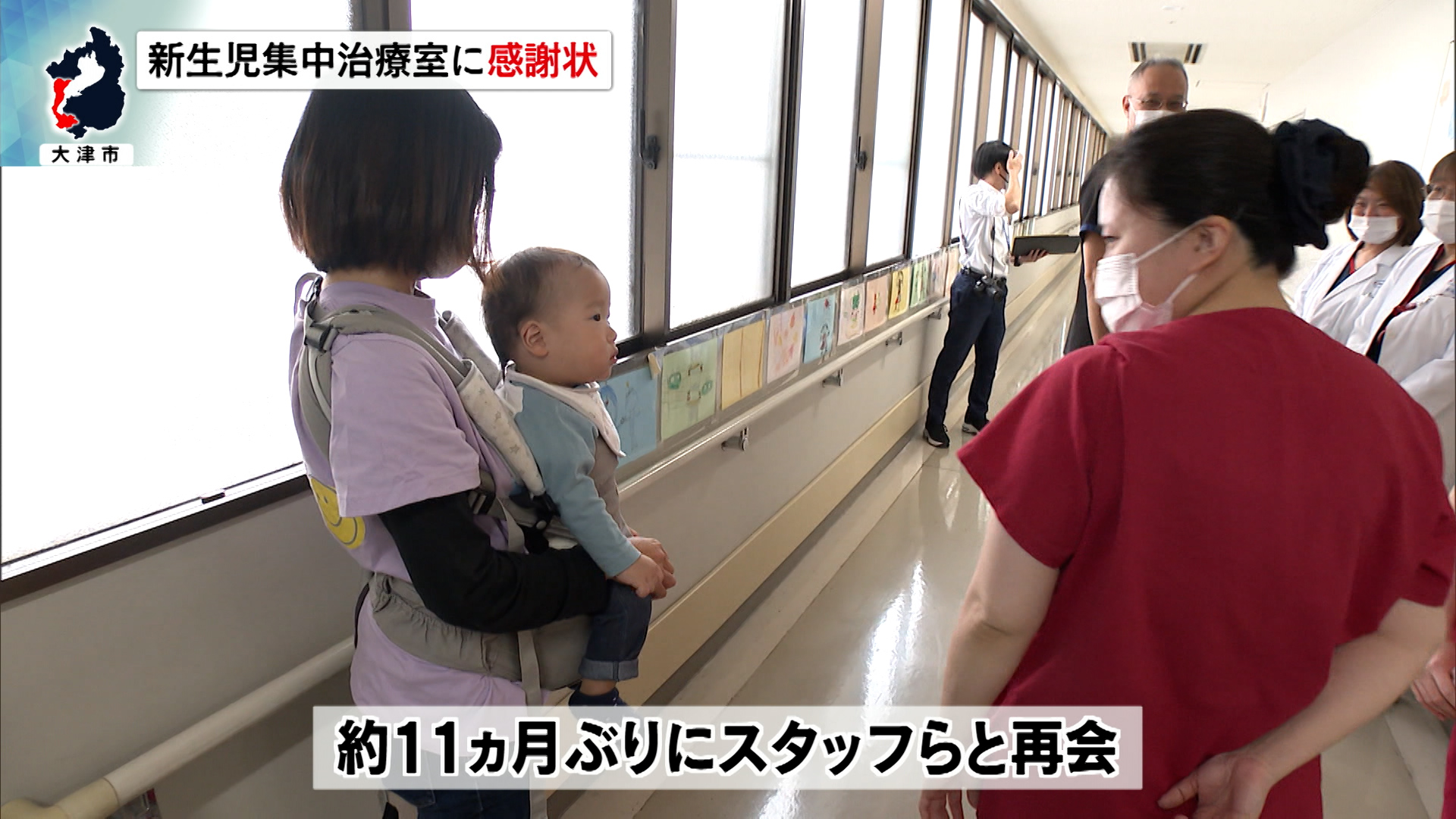 この日、お母さんと一緒に大津赤十字病院を訪れた亀井生斗くん(1歳3ヵ月)は、予定より1ヵ月と20日早く1274グラムで生まれ、NICUで高度な治療を受けました。その後すくすくと成長し、この日は退院してから約11ヵ月ぶりにNICU のスタッフらと再会しました。