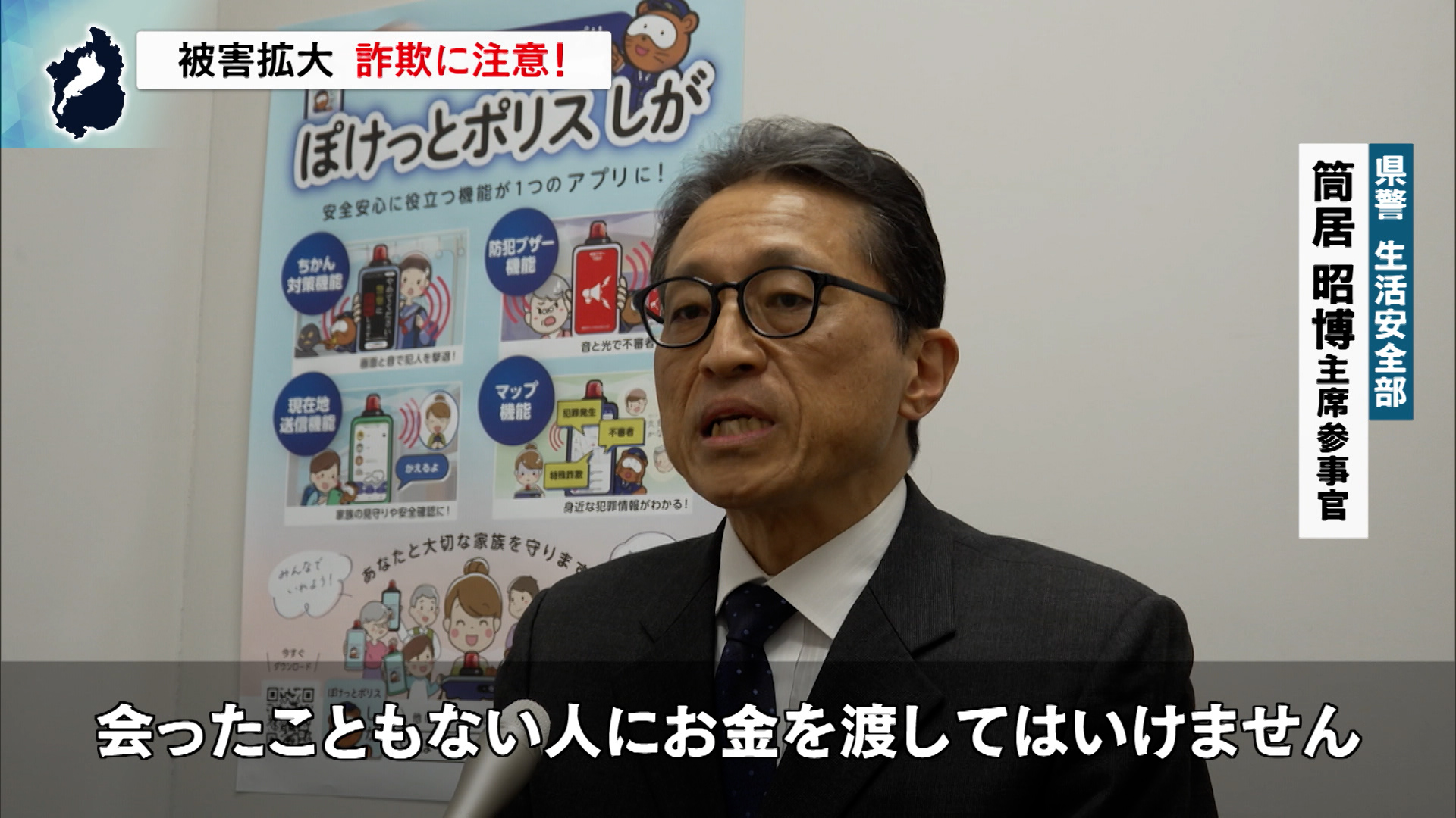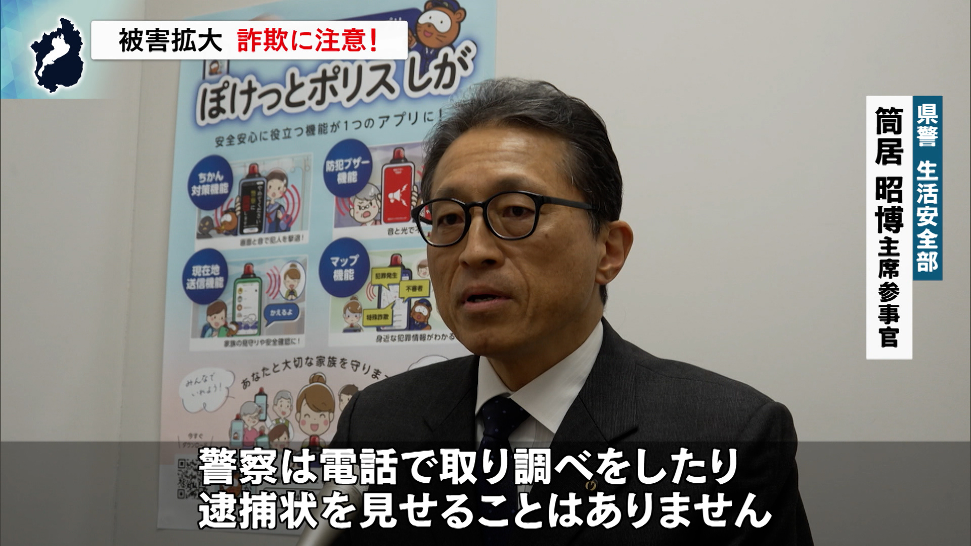 滋賀県警・生活安全部の筒井 主席参事官は「今年は特に、偽警察官が捜査の目的で金銭をだまし取るニセ警察官詐欺が激増しているのですが、警察は電話で取り調べをしたり逮捕状を見せることはありません」