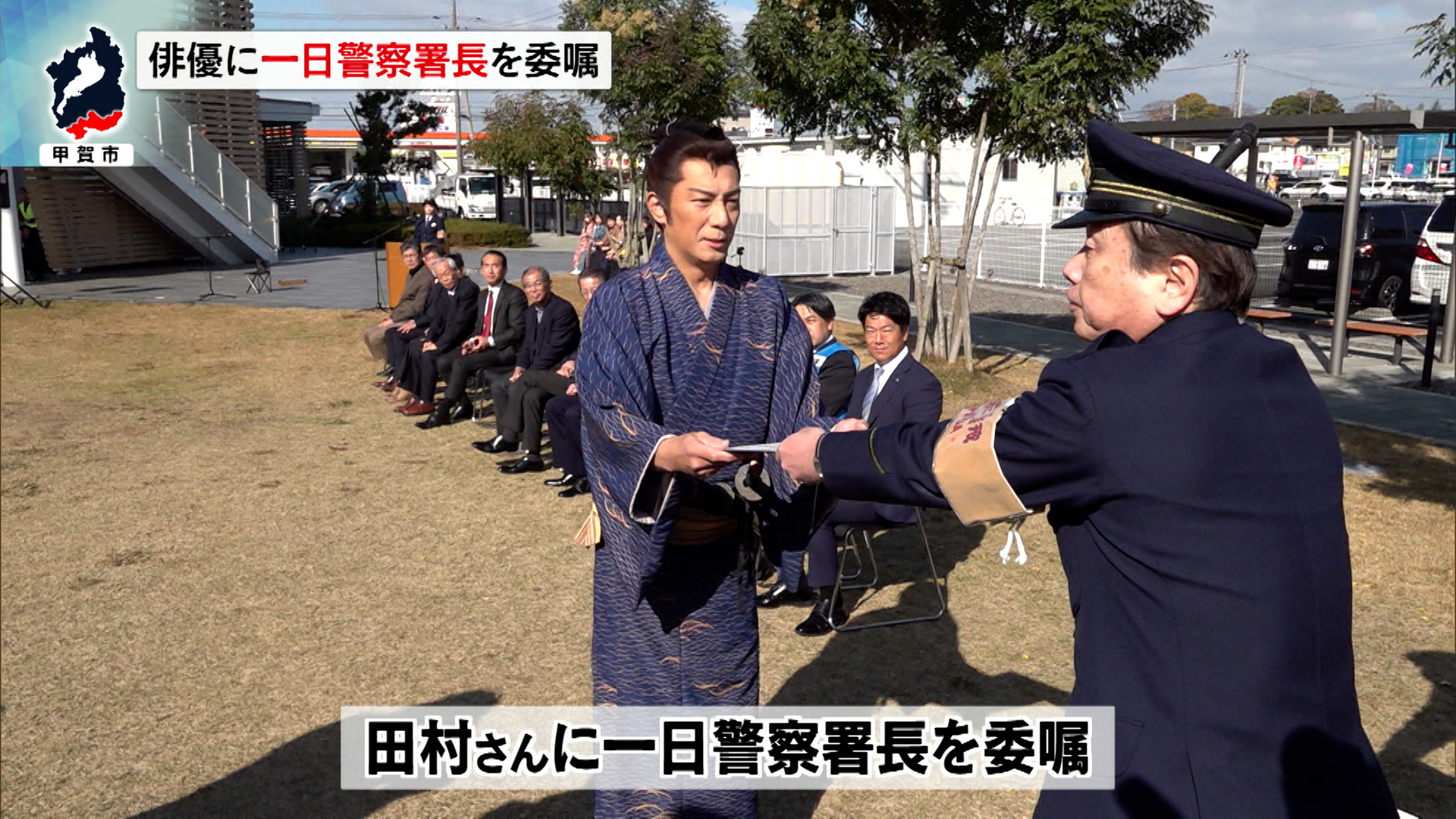 任命式には、監督の安田淳一さんも出席したほか、甲賀市の岩永裕貴市長や警察、地域住民らが参加しました。田村さんには、甲賀署の橋本登署長から一日警察署長の委嘱状が手渡されました。