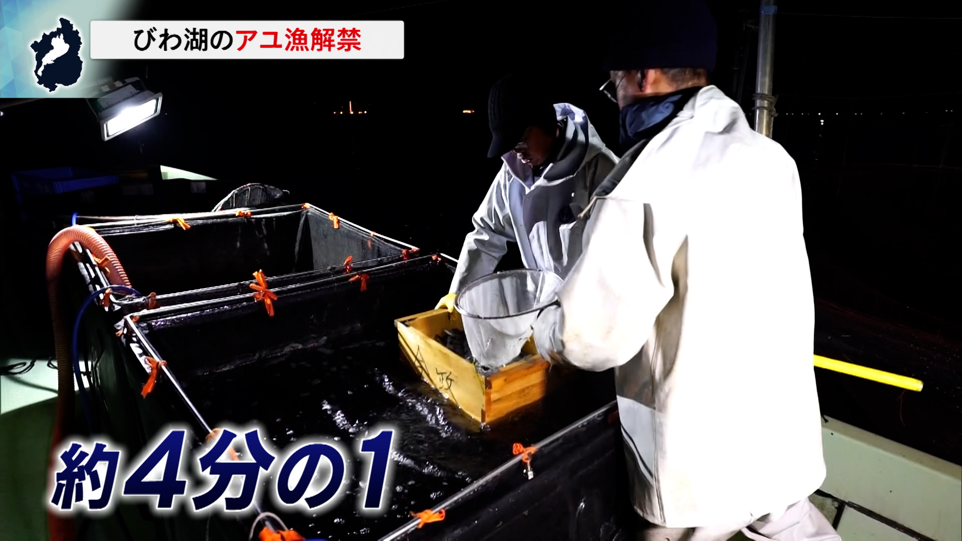 午前4時の大津市堅田漁港。アユ漁解禁日の1日、堅田漁業協同組合の副組合長・今井政治さんの船が、びわ湖のおよそ3キロ北に仕掛けた定置網の「魞(えり)」に向かい、「ツボ」と呼ばれる先端部に追い込まれた小さなアユをすくい上げていきます。
