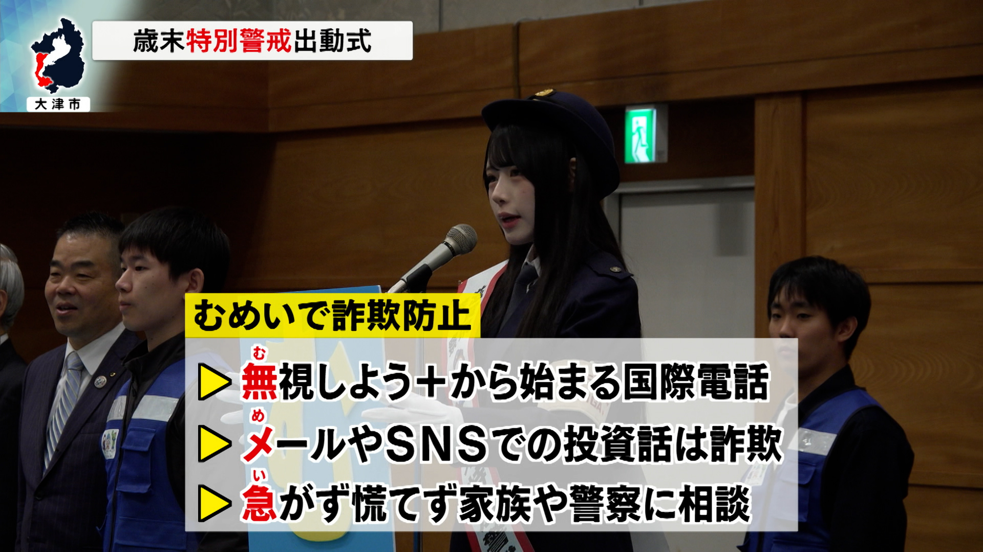 また今年は、数々のSNSで活躍している滋賀県出身のインフルエンサー むめいさんが歳末特別警戒本部長に任命され、詐欺防止に取り組む合言葉として「むめい」から一文字ずつを取った「無視しよう+(プラス)から始まる国際電話」「メールやSNSでの投資話は詐欺」「急がず慌てず家族や警察に相談」の3つのスローガンを全員で復唱しました。