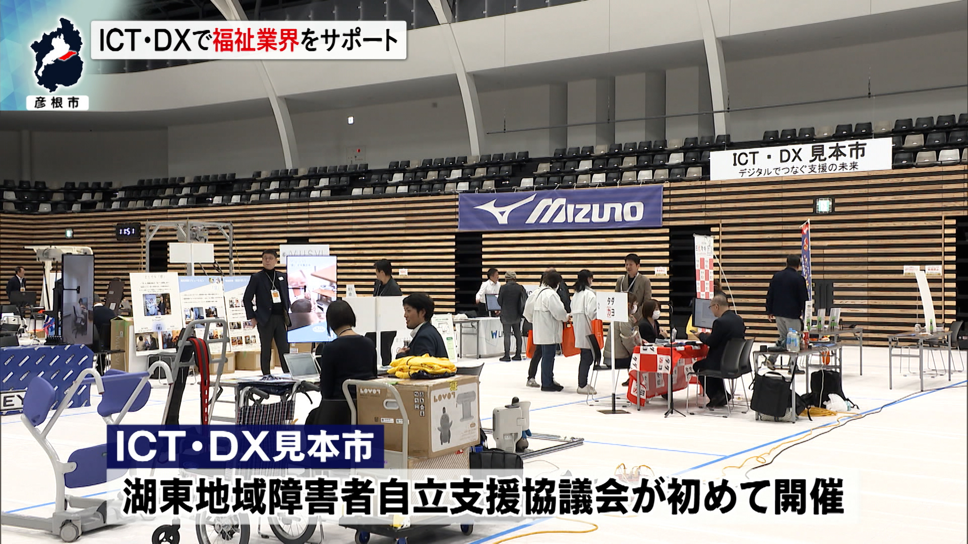 この「ICT・DX見本市」は、彦根市など1市4町の障害者福祉の事業所で構成される湖東地域障害者自立支援協議会が初めて開いたものです。福祉の現場では、支援の質を高めたいにも関わらず、記録や連絡などの事務作業に追われているといった課題も多く、会場には、そういった課題の解決につながる最新のICT技術やDXの取り組みを体験してもらうブースが並びました。こちらは、赤外線でシルエットを映し出し、夜間の入所者の様子を確認できる見守りセンサです。ベッドから起き上がったり、はみ出したりしそうになった場合は、職員のスマホに通知され、部屋を開けなくても様子がわかり、カメラではなく、シルエットなので、入所者のプライバシーも守られるということです。主催した協議会では、今回は湖東圏域での実施だったので、次回は、課題解決のため、県内全域で協力してやっていきたいとしています。