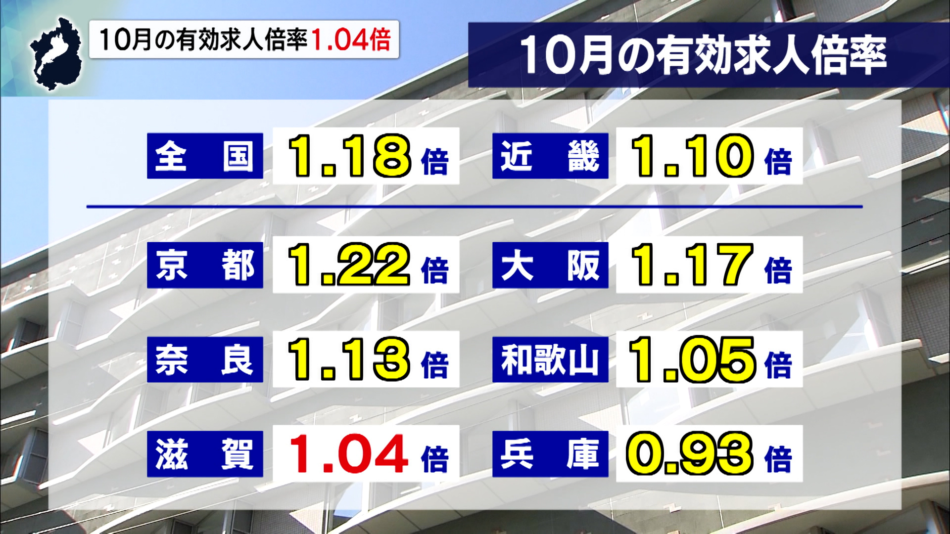 なお全国も、前の月を0.02ポイント下回った1.18倍、近畿も前の月を0.03ポイント下回る1.10倍で、滋賀は、近畿2府4県の中で第5位です。