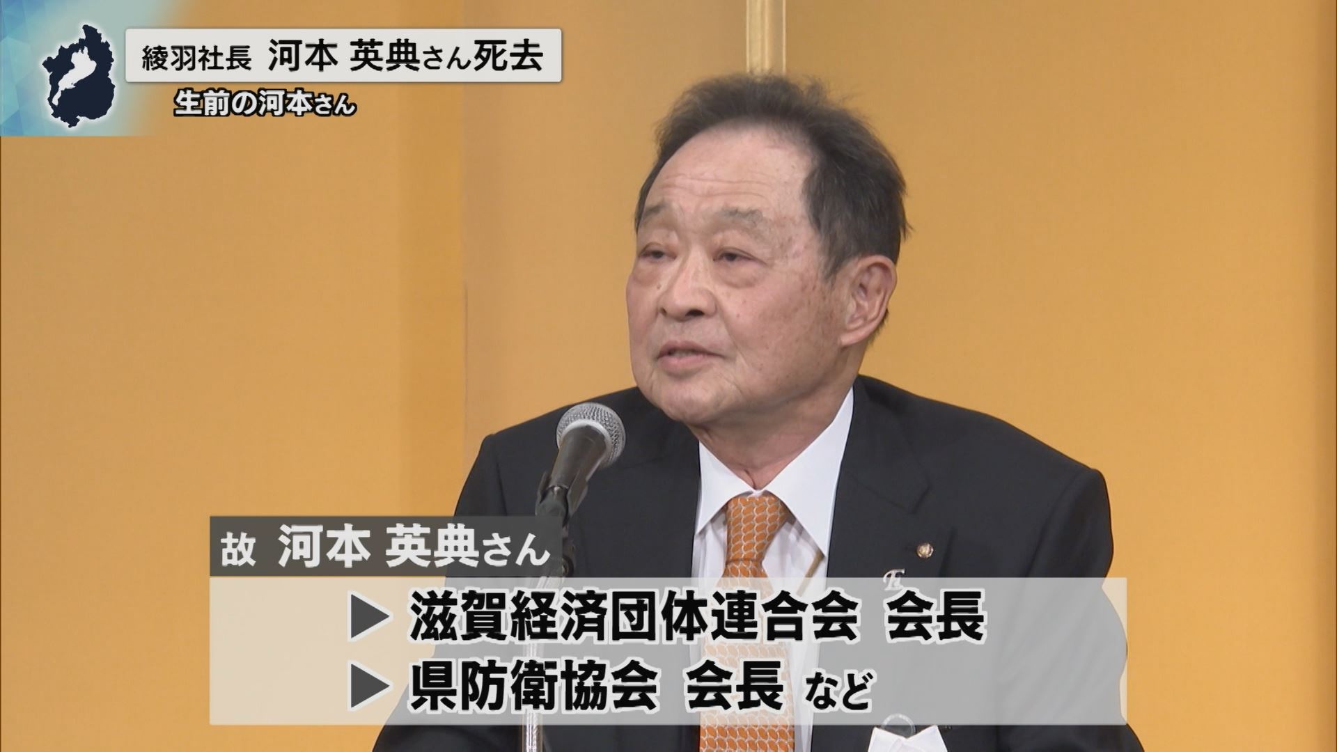 河本英典さんは、高島市出身で1972年に綾羽に入社し、1983年に社長に就任。また滋賀経済団体連合会の会長といった経済界だけでなく、県防衛協会の会長など幅広い分野の要職も務めてきました。