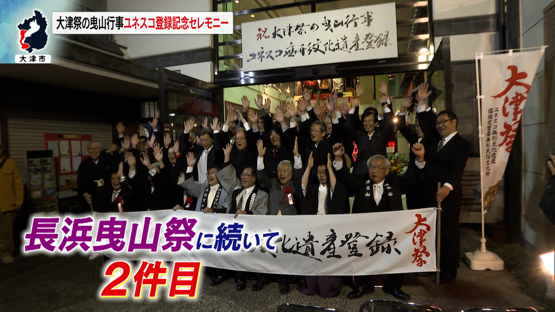 登録決定を受けて、大津祭曳山展示館では記念セレモニーが行われ、大津祭の関係者をはじめ大津市の佐藤市長ら約100人が集まりました。セレモニーでは、滋賀県書道協会の神田浩山理事長の書による看板の除幕式や鏡開きなどが行われ、お祝いムードに包まれました。