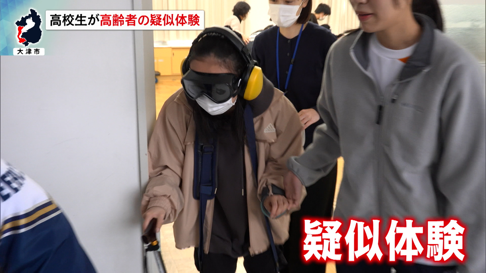 12日は市内の膳所高校で出前講座が開かれ、1年生の生徒らが高齢者の体の特徴を学ぶため、思うように歩いたり食べ物を飲み込んだりできない高齢者の体の動きを実際に体験しました。