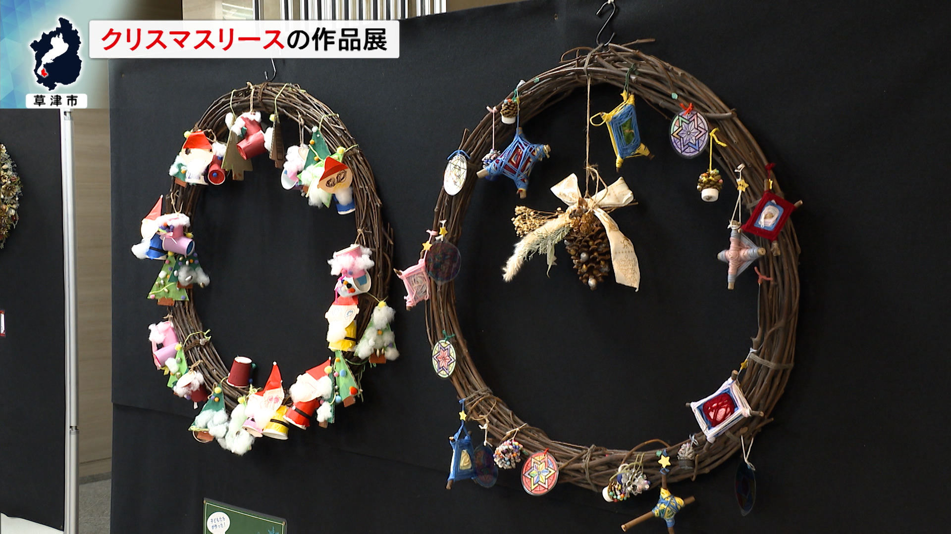 クリスマスリースコンテストに出品された力作17点のほか、草津市内のこども園や保育所の園児たちが飾り付けしたリースなど合わせて約30点が並んでいます。