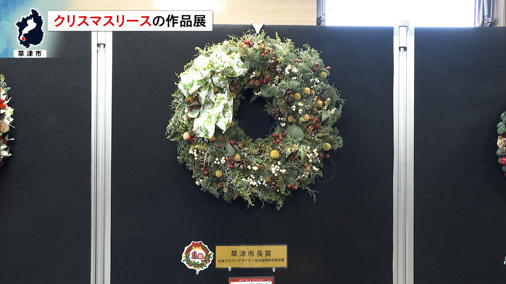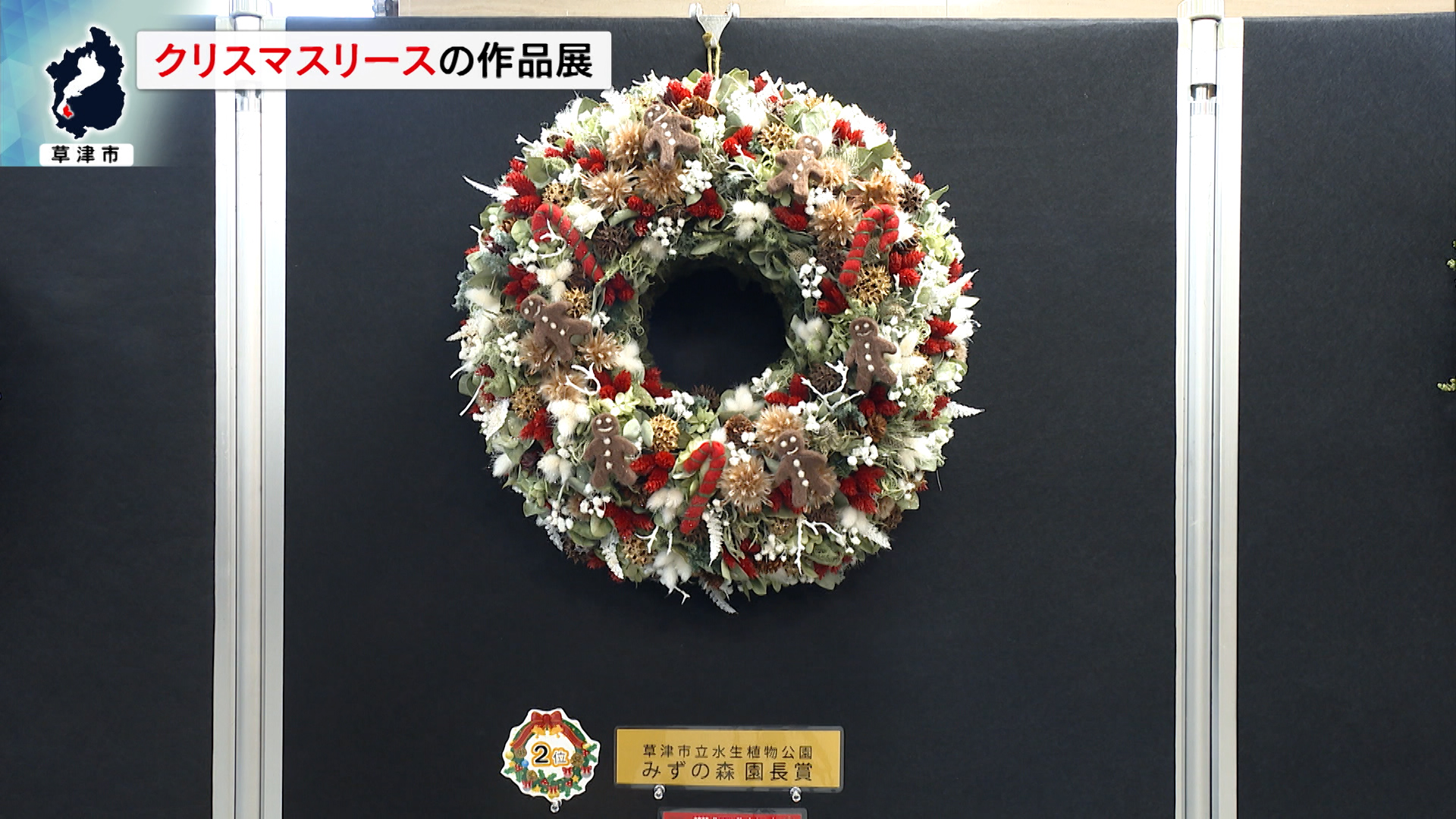コンテストでグランプリにあたる草津市長賞・日本フラワーデザイナー協会滋賀県支部長賞には、針葉樹を使って自然感を全面に出して丁寧に制作されたリースが選ばれました。「みずの森園長賞」の受賞作品は、形のバランスが良く、クリスマスの楽しい雰囲気が表現されています。このほか、ホワイトクリスマスをイメージしたものや三日月の形をしたリースなどが展示されています。