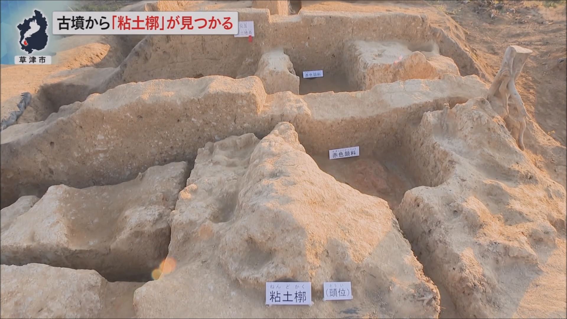 草津市によりますと、「粘土槨」は、古墳時代前期から中期にかけてみられる埋葬施設の一つで、木棺を収納しそれを粘土で包み保護する構造です。