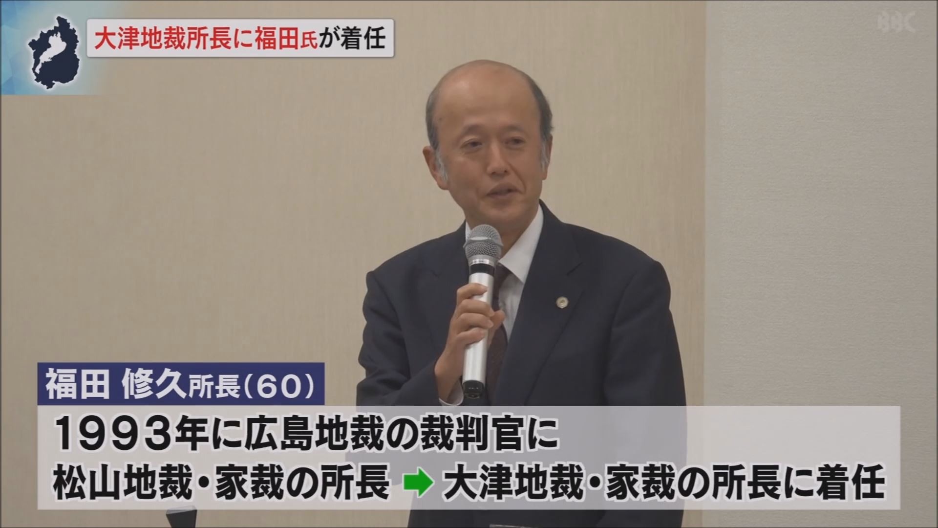 福田氏は岡山県備前市出身の60歳。1990年に司法試験に合格後、1993年に広島地裁の裁判官に任官しました。そして和歌山地裁や大阪地裁、大阪高裁などで勤務を重ね、松山地裁・家裁の所長を経て11月23日付けで大津地裁・家裁の所長に着任しました。