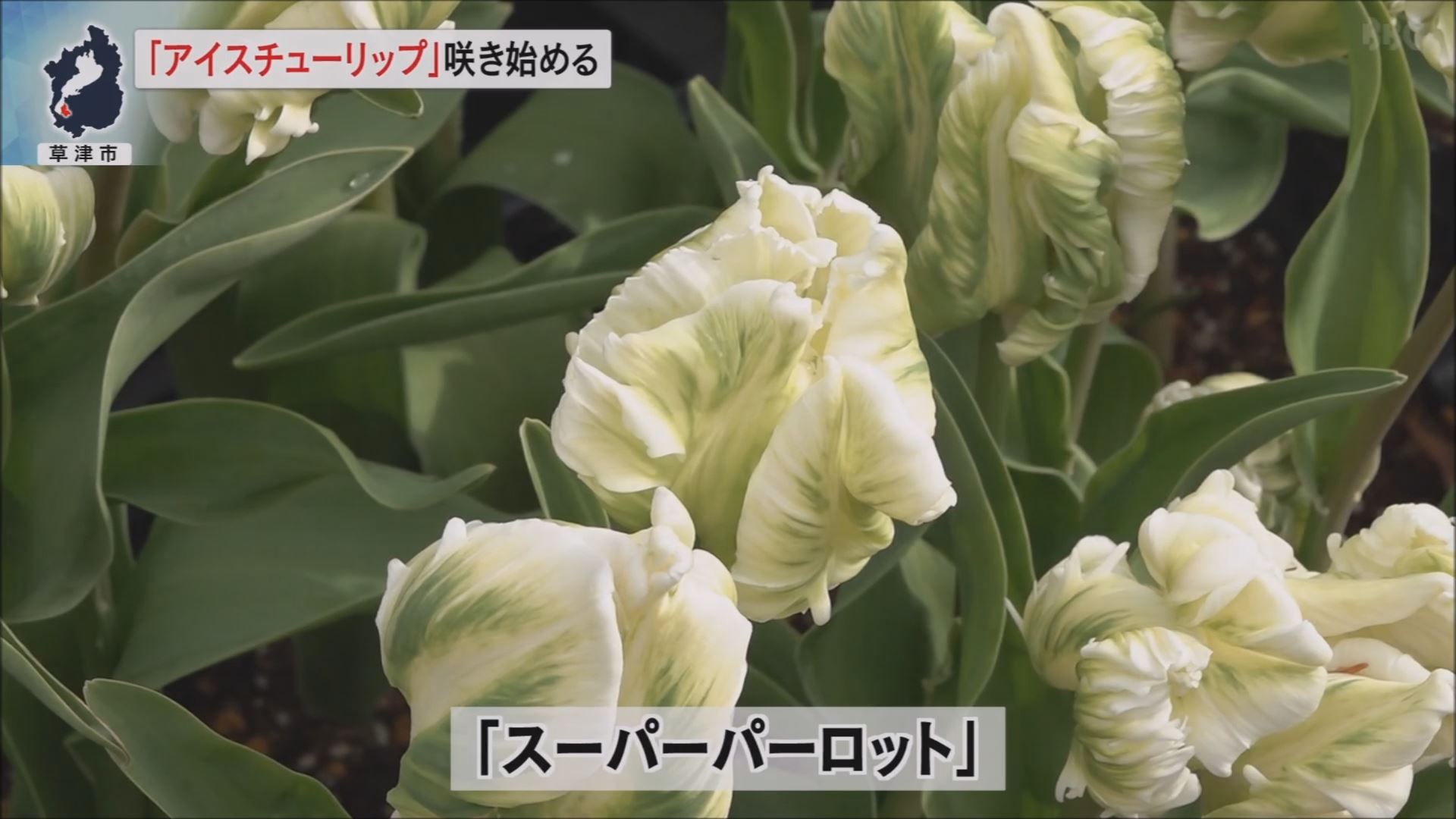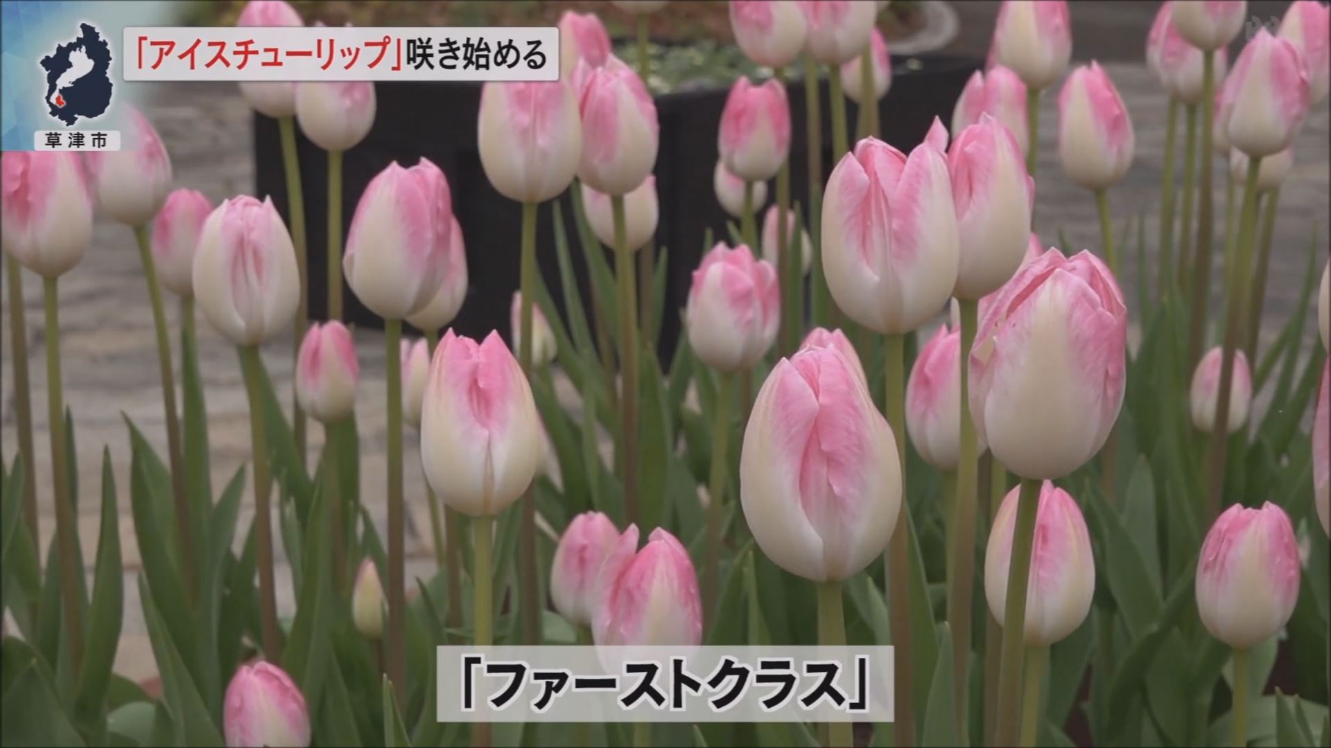 「アイスチューリップ」は、球根を発芽させた後に一定期間低温処理をしたもので、外気に触れることで開花させることができます。現在は10品種、約2000株が展示されていて、白色とピンク色の2色が美しい「ファーストクラス」や