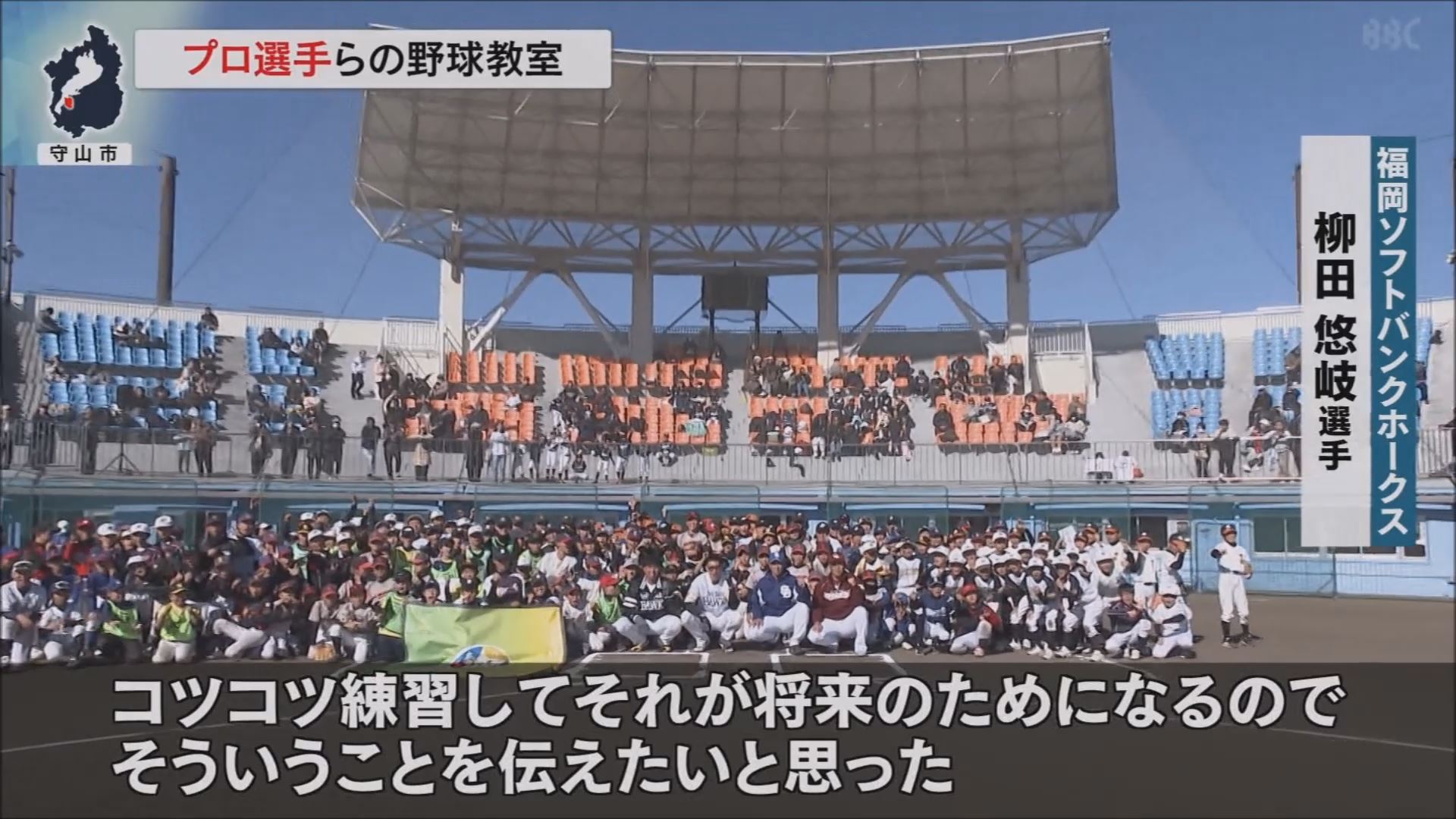 守山市民球場で開かれた教室には、小学3年生から6年生の子供たちおよそ240人が参加し、福岡ソフトバンクホークスの柳田選手や滋賀県出身の3人の元プロ野球選手から指導を受けました。