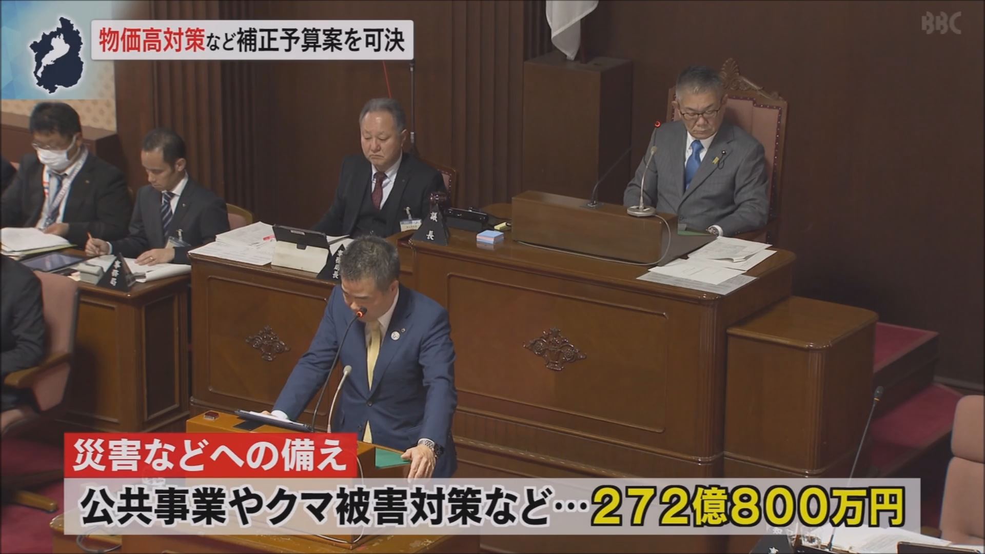 19日、新たに提出された補正予算案は一般会計で約379億1100万円を追加するものです。これは国の重点支援地方交付金を活用したもので、物価高対策として新たな事業の展開や人材育成、賃上げなどに意欲的に取り組む中小企業に対し支援を行う「滋賀県未来投資支援事業」などに約80億2000万円が、また「災害などへの備え」として防災、減災などを目的とした公共事業やクマ被害対策などに約272億800万円が盛り込まれました。