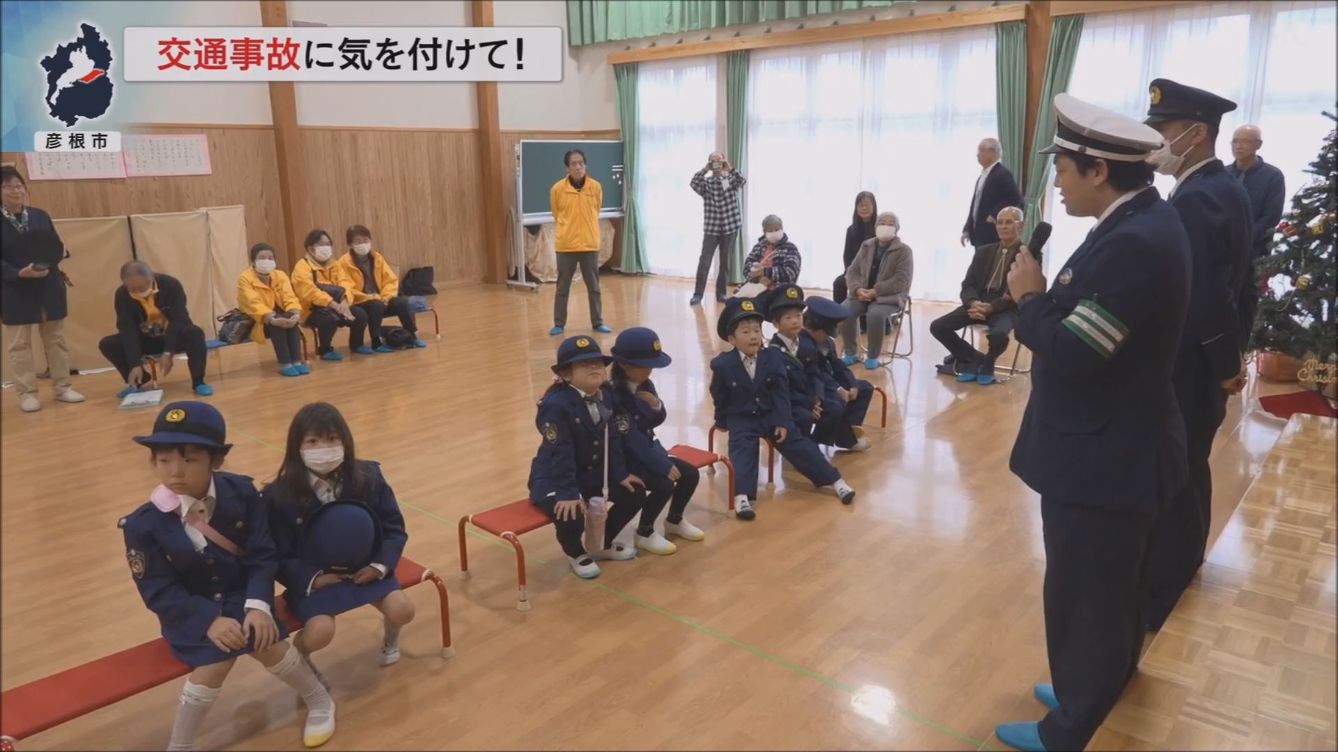 彦根市にある平田こども園では24日の朝、近隣住民に交通事故防止を呼び掛けるジュニアポリスの出動式が行われました。