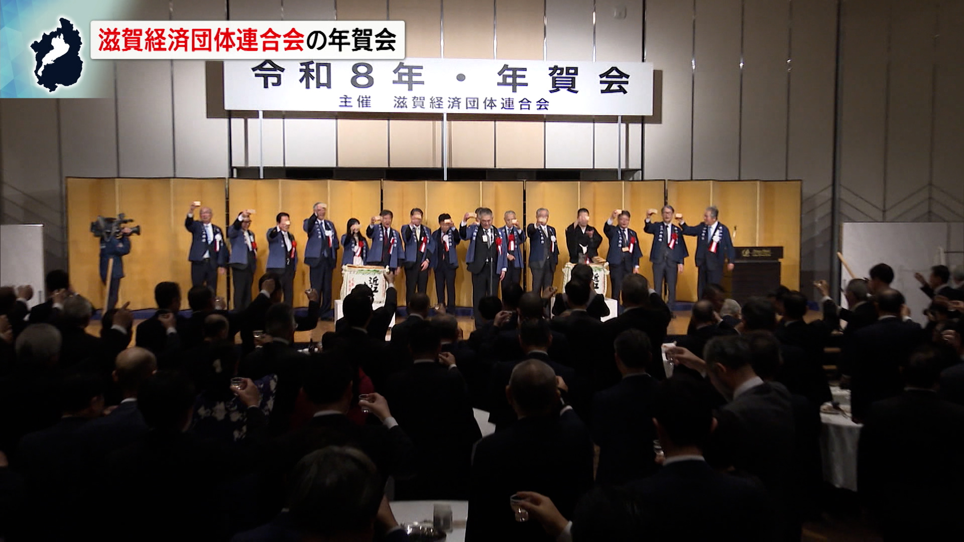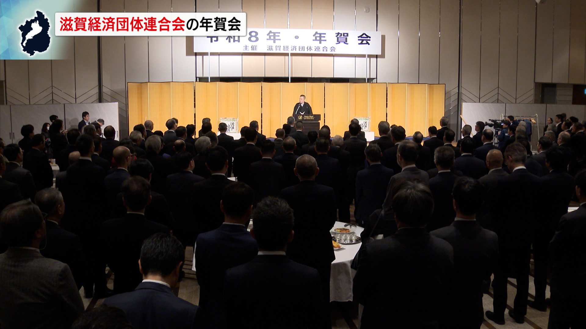 大津市内で開かれた年賀会には、滋賀経済団体連合会を構成する県内の6つの経済団体の会員をはじめ、知事や市長・町長ら約600人が出席しました。