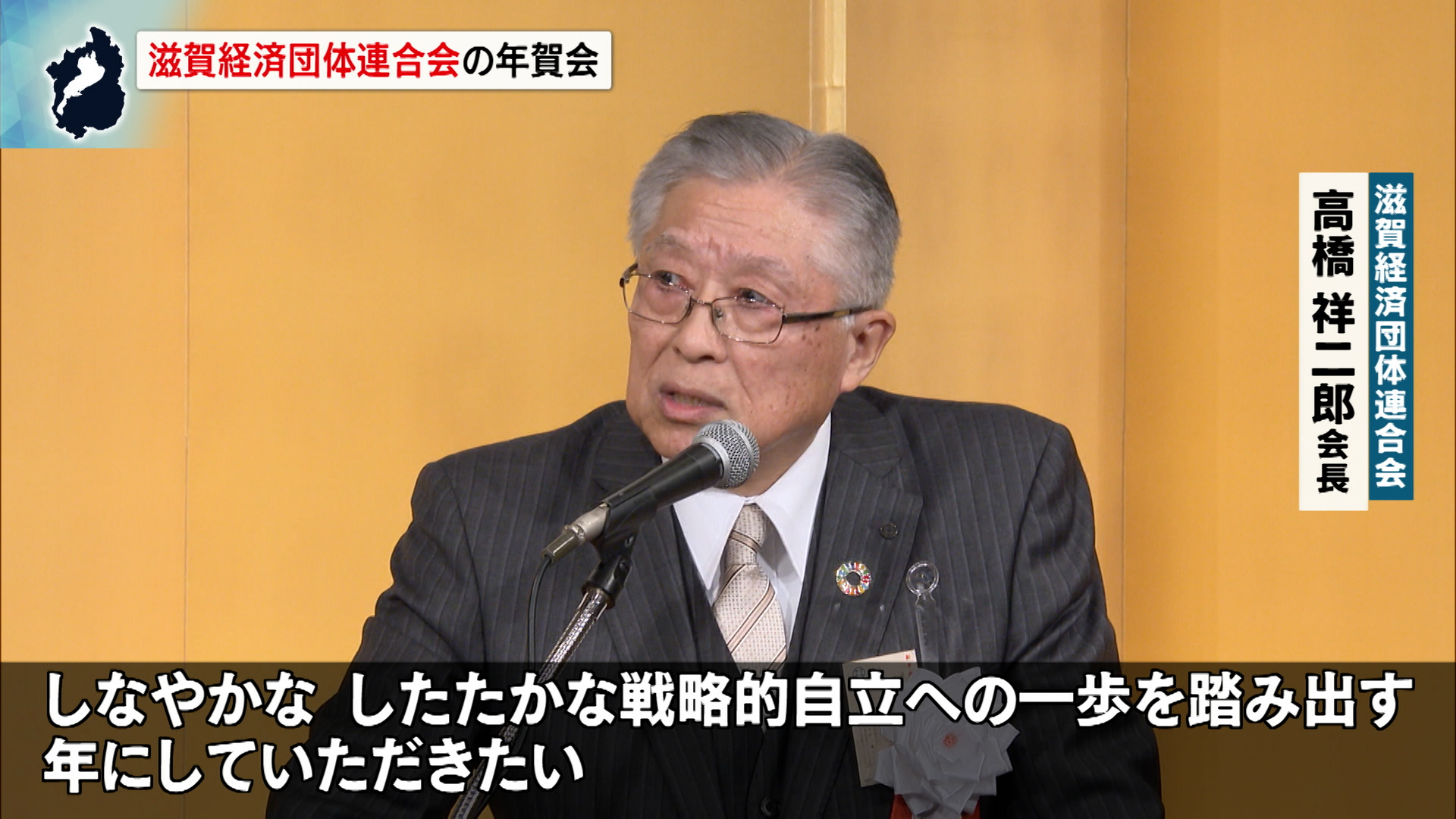 年賀会では冒頭、去年11月に亡くなった滋賀経済団体連合会の前会長・河本英典さんを偲び、出席者が黙とうを捧げました。また、河本前会長に代わり新しく就任した高橋祥二郎会長が挨拶に立ちました。