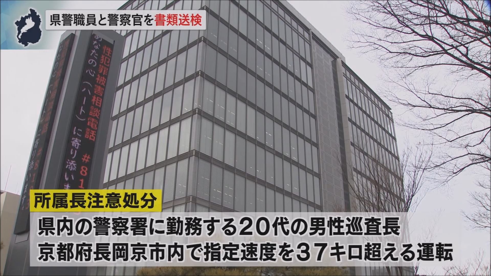 このほか県警は、京都府長岡京市内の一般道で50キロの指定速度を37キロ上回る速度で運転したとして、県内の警察署に勤務する20代の男性巡査長を所属長注意処分としたことも取材に対して明らかにしています。