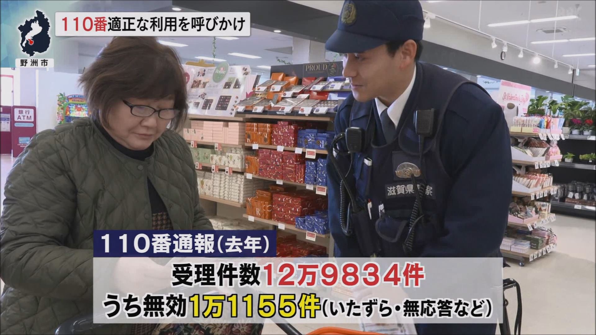 これに合わせ、野洲市の商業施設では、110番の適正な利用を呼びかける啓発活動が行われました。