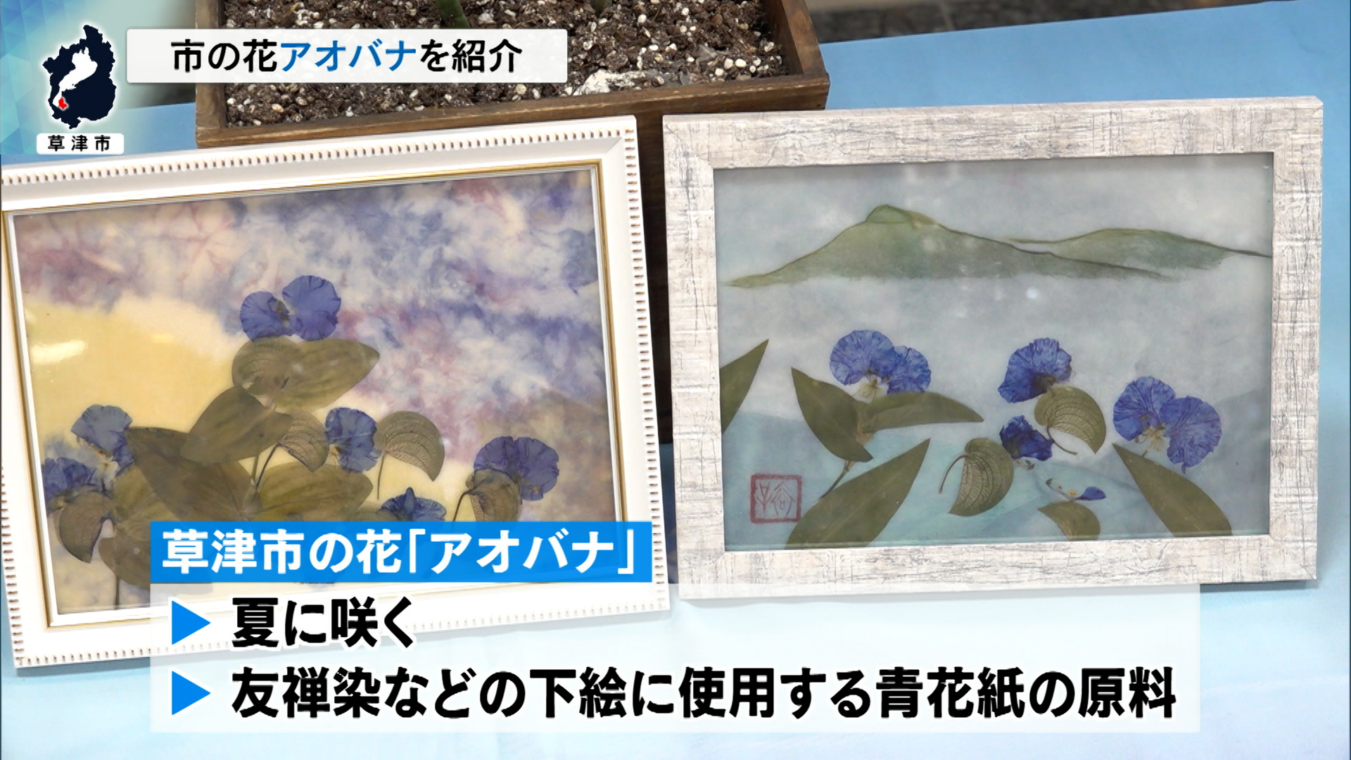 アオバナは、夏に咲く花で、友禅染などの下絵に使用する青花紙の原料として、草津市で古くから栽培され、草津市の花に認定されています。