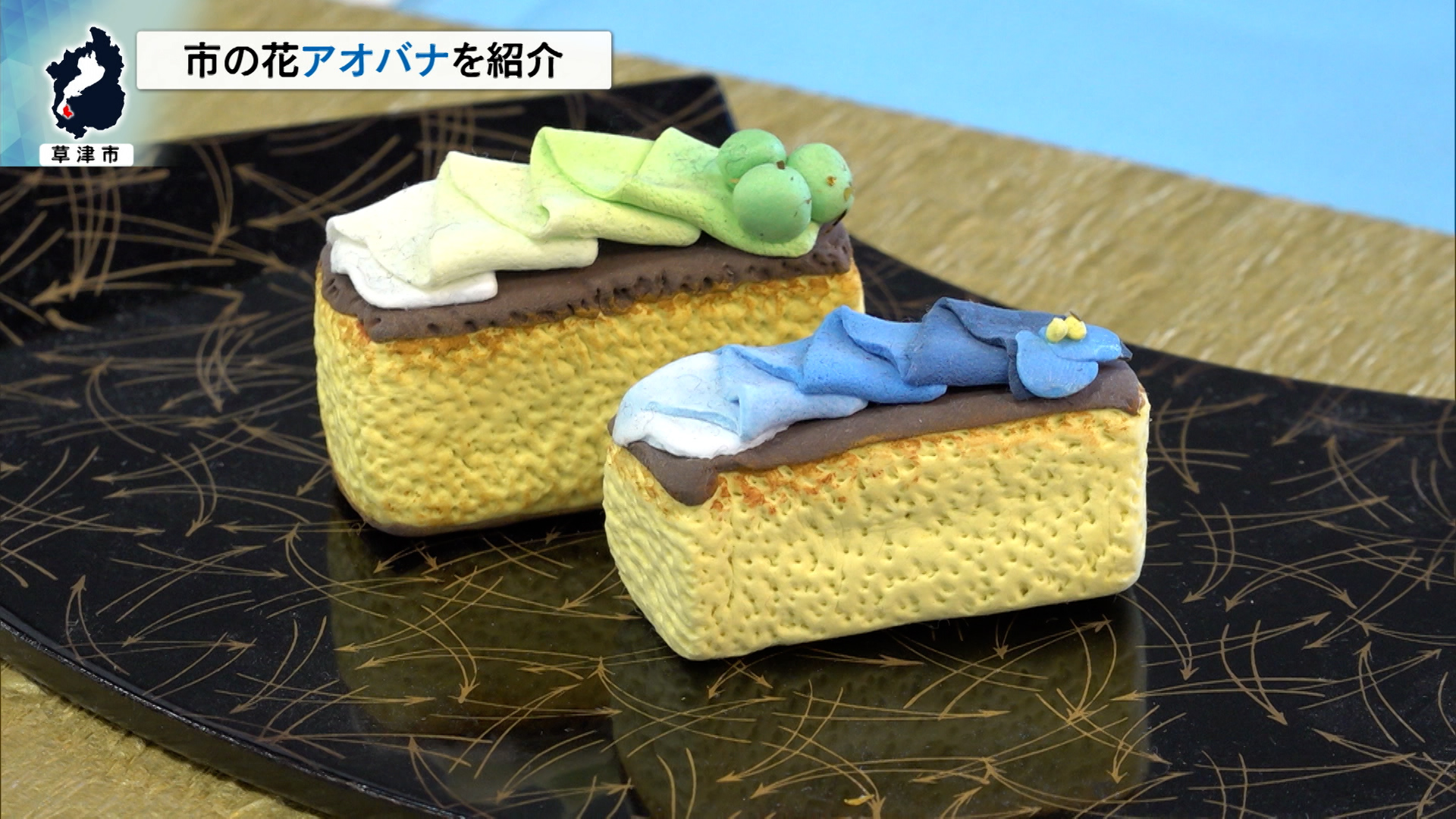 会場では、市内の小中学生のアオバナに関する学習成果などが紹介されています。このうち草津中学校の生徒たちは、アオバナを使った草津の良さをPRできる和菓子を考案。アイデアスケッチをもとに樹脂粘土で制作しています。