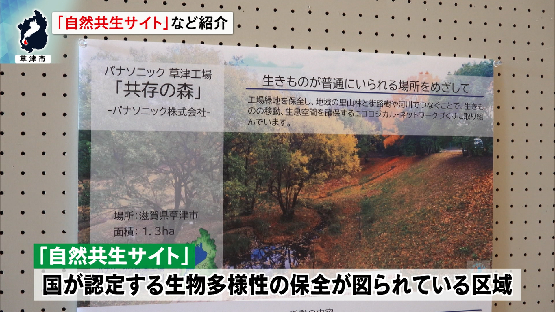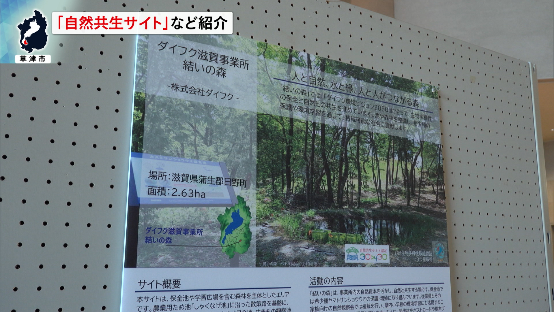 パネルでは、住民らでつくる「上山町神明ともいきの会」が取り組んでいるびわ湖で絶滅状態にあるという「カワバタモロコ」が生息するため池や里山の保全活動をはじめ、湧き水のある小川や池にすむ絶滅危惧種のハリヨの保護などに取り組む旭化成守山製造所のビオトープや、絶滅危惧種の「ヤマトサンショウウオ」の保護・増殖などに取り組む日野町のダイフク滋賀事業所の保全池などが紹介されています。