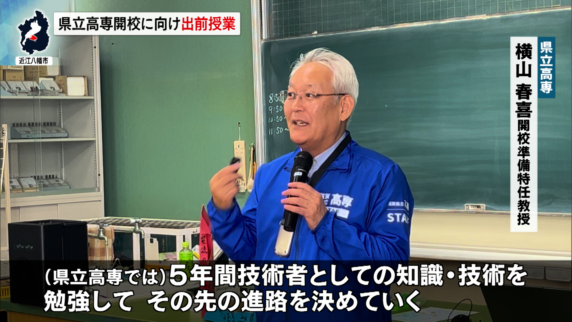 近江八幡市の安土中学校で行われた出前授業には、県立高専に入学すれば一期生にあたる1年生、約130人が参加しました。授業はクラスごとに行われ、県立高専・開校準備特任教授らが、はじめに県立高専について説明しました。