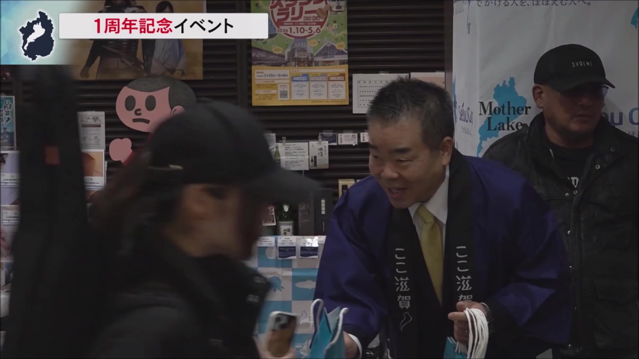 18日、駅の改札前では滋賀県の物産会が開かれ、三日月知事や西武ホールディングスの西山隆一郎社長が駅の利用者らに滋賀の魅力をPRしました。