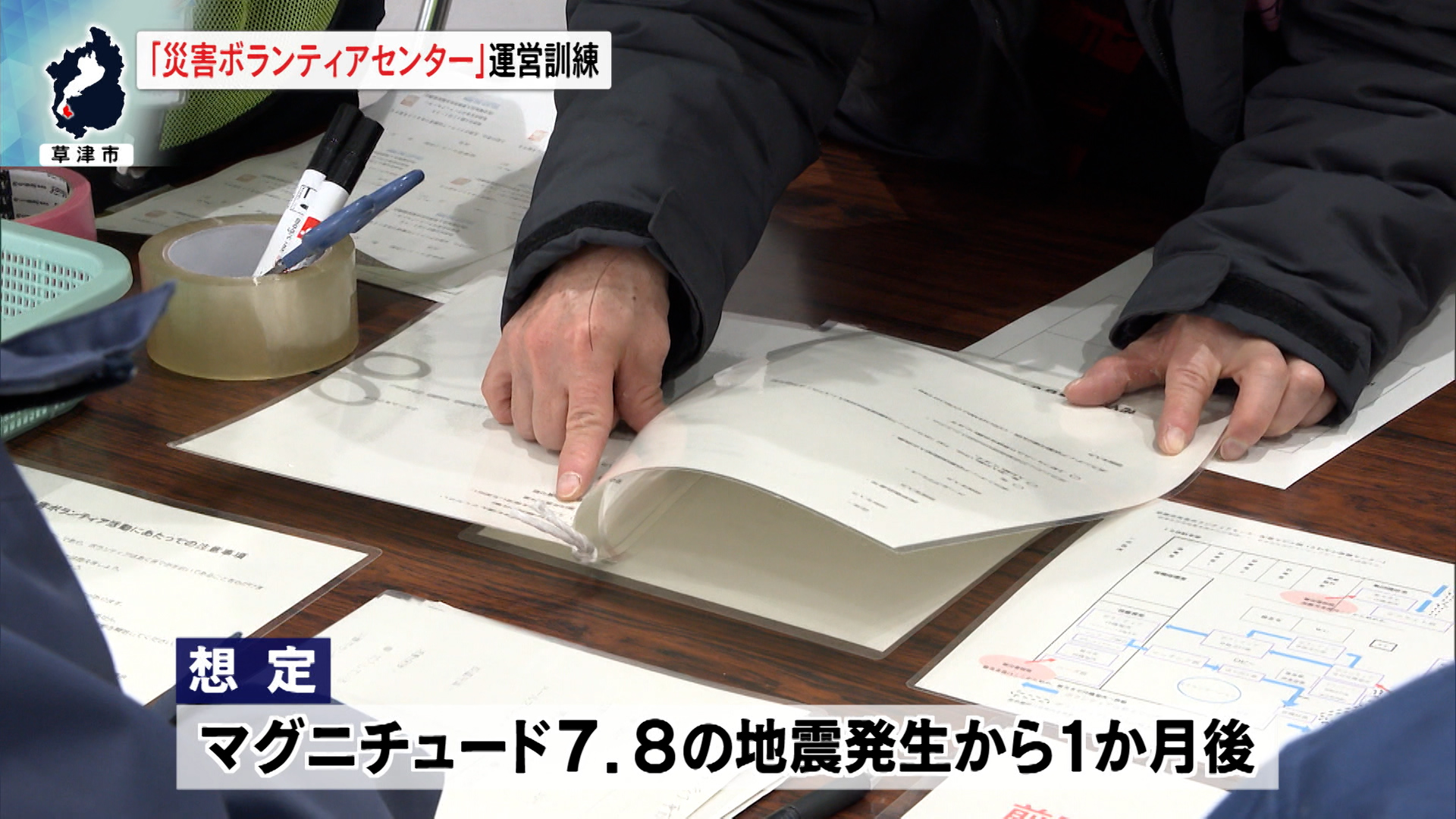 訓練は、災害発生時に「災害ボランティアセンター」を設置する役目がある草津市社会福祉協議会が中心となって毎年行っているもので、マグニチュード7.8の地震が発生してから1か月が経ち、生活再建のための様々なニーズが出てきたという想定で行われました。