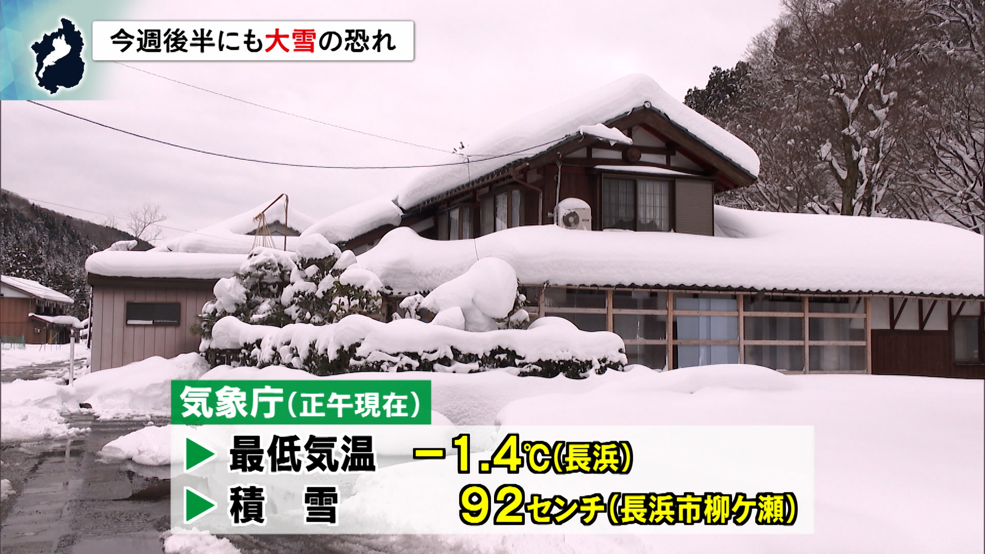 雪かきをしていた住民は「4、5回(雪を)どかしている毎日、毎日。(屋根の積雪は)1メートル50センチ近くになったら、屋根の雪を落とさないといけない」と話していました。彦根地方気象台によりますと、降り積もった雪が溶けにくい状況で、今週後半にふたたび大雪の恐れがあり、備えを呼びかけています。