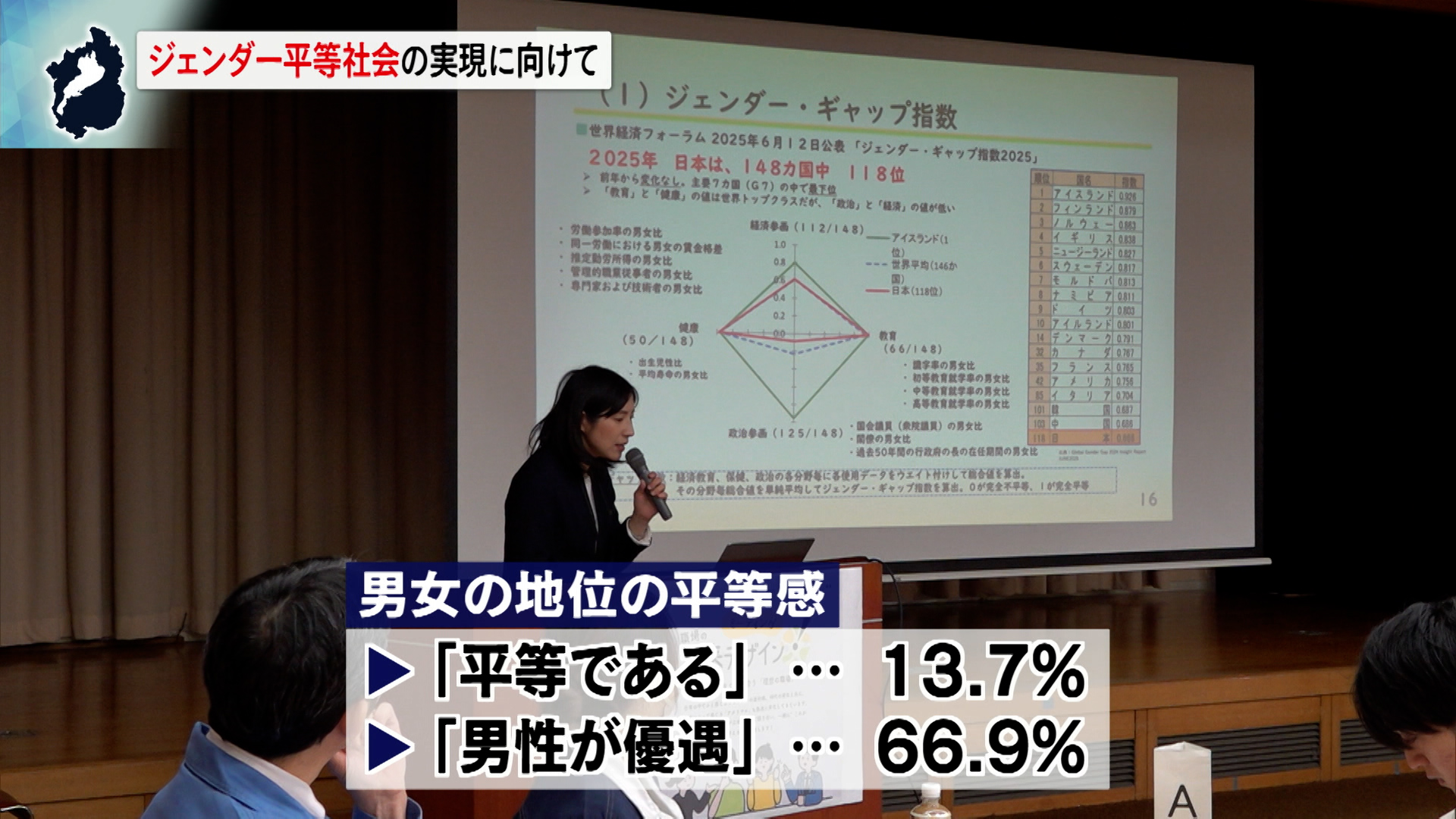 この中では、県が行った意識調査をもとに、「男女の平等感」について「平等である」は13・7%、「男性が優遇されている」が66・9%だったことなどが紹介されました。