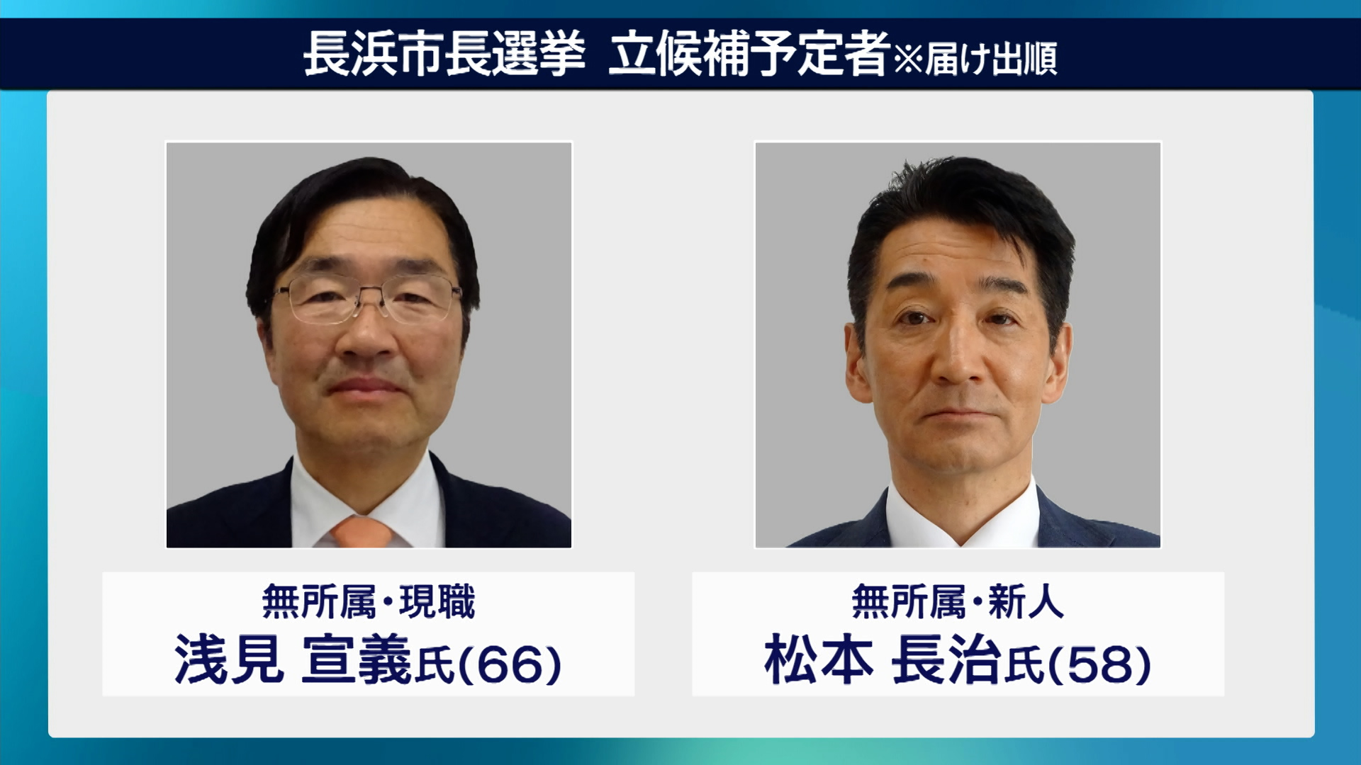 長浜市長選挙に立候補したのは、いずれも無所属で、届出順に、現職で2期目を目指す浅見宜義さん・66歳と、新人で元長浜市議会議員の松本長治さん・58歳の2人です。